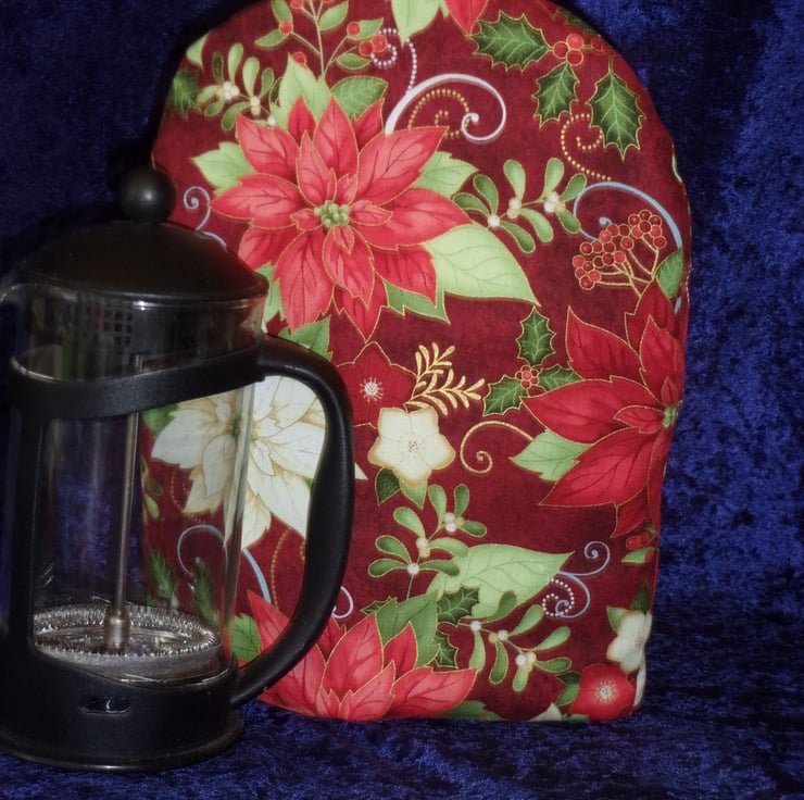 This Christmas Themed Coffee Pot or Cafetere Cosy is designed for a larger pot - 6-8 Cup - and will keep your Coffee hot for a couple of hours.