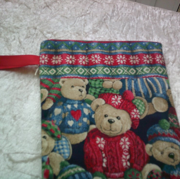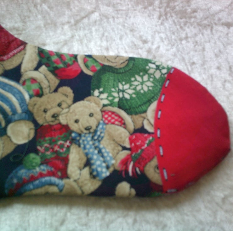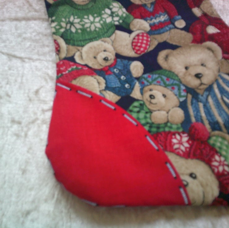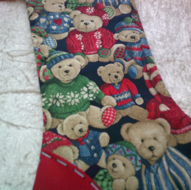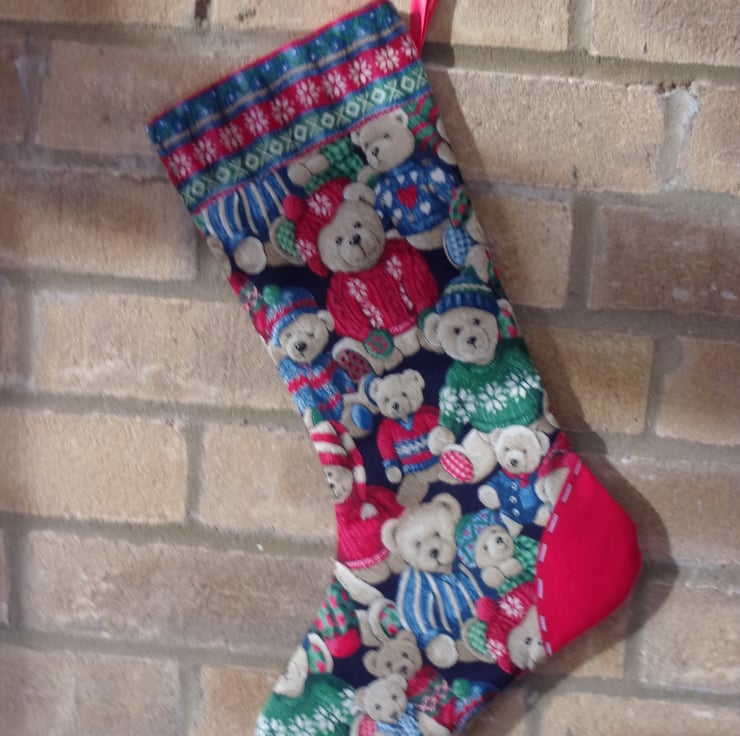 This Christmas Stocking features a design of Teddy Bears in their Christmas Jumpers. Both sides of the stocking - which measures approximately 15 inches (38 cm) from the top to the bottom of the foot - are identical.