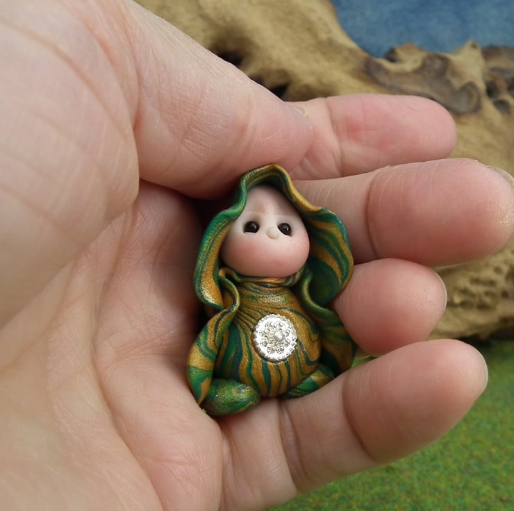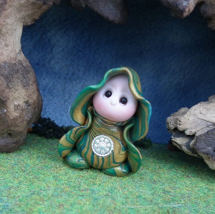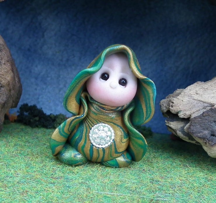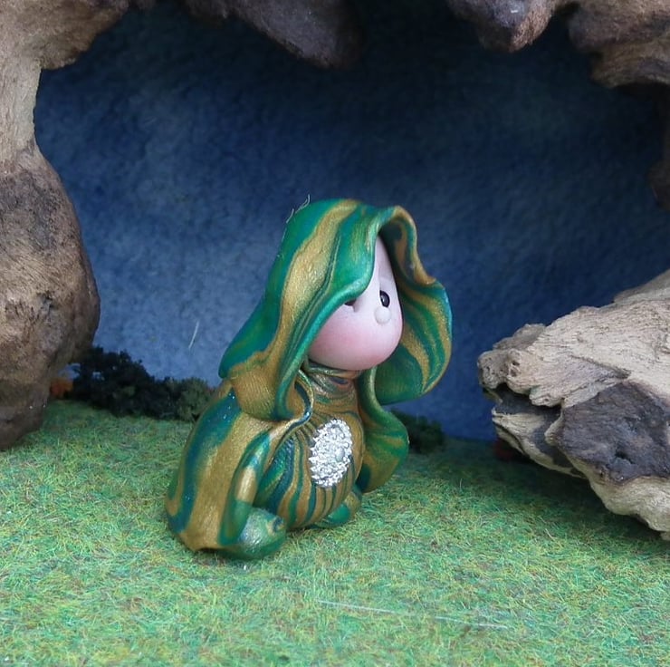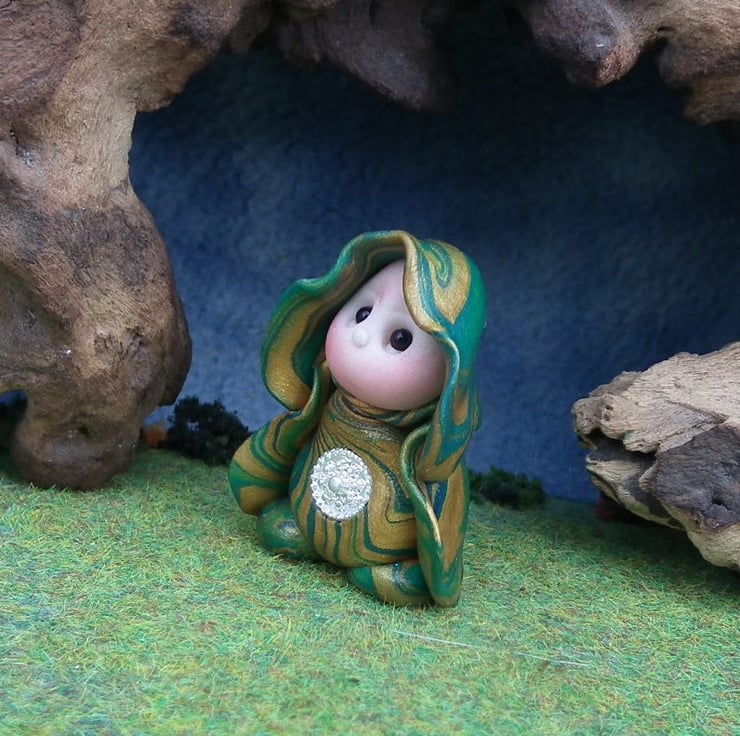 This is a 'one of a kind' creation having been entirely handmade without the use of moulds here at my studio on the Sussex Coast. Modelled with Prosculpt polymers, painted with heat set paints before sealing with lacquer, Bess has sparkling black onyx eyes and variegated robes. Bess the Gnome Maiden is just one and a half inches tall.