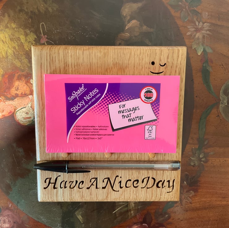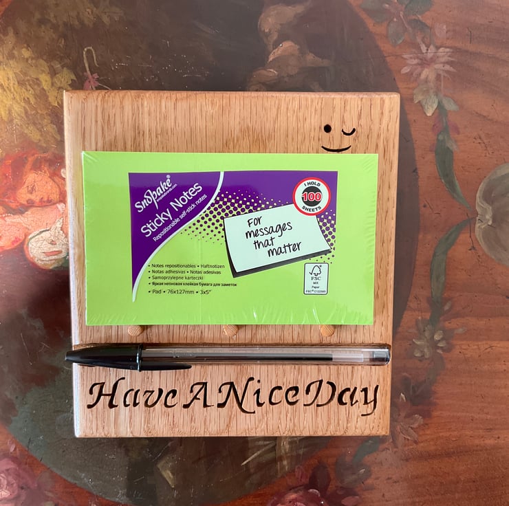 'Have A Nice Day' note pad made from oak. The pad lettering is cut through along with a groove to keep pen. Pad is finished to satin gloss.