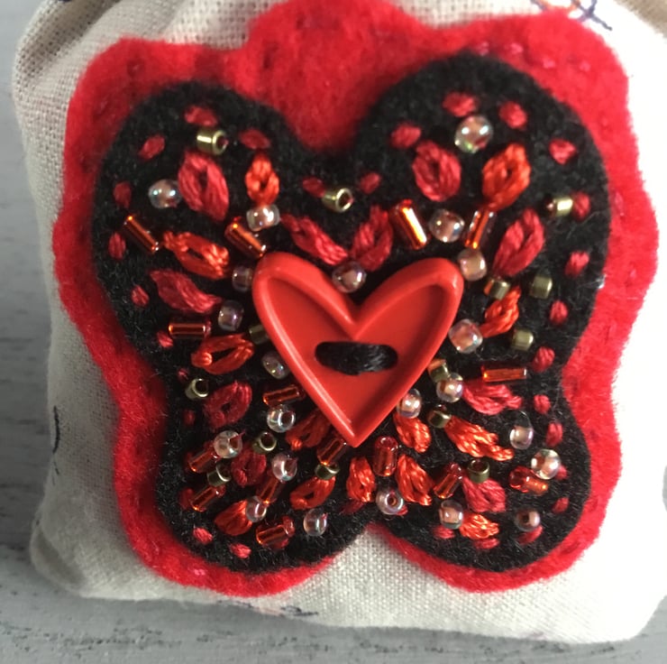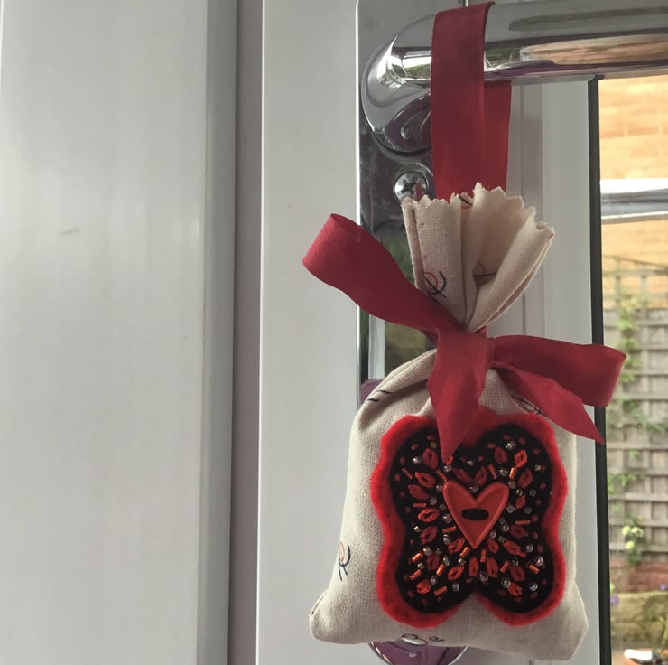 I loved creating the hand embroidery around the red heart button and filling it with dried lavender from my garden in Sheffield, Yorkshire.
