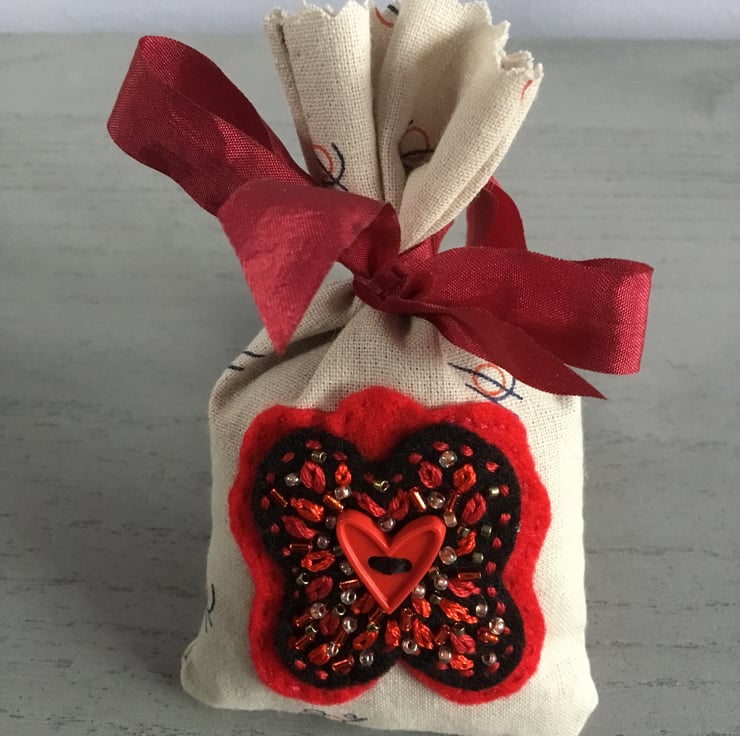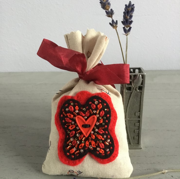 A small button of a red heart is at the centre of the hand embroidery on this lavender bag. This button is sewn onto a background of red and black felt, lazy daisy embroidery stitches, seed and bugle beads in red and cream surround the heart, the beads glisten in the light. The embroidery is sewn onto a cotton fabric bag, cream in colour with a small circular pattern in red and black.