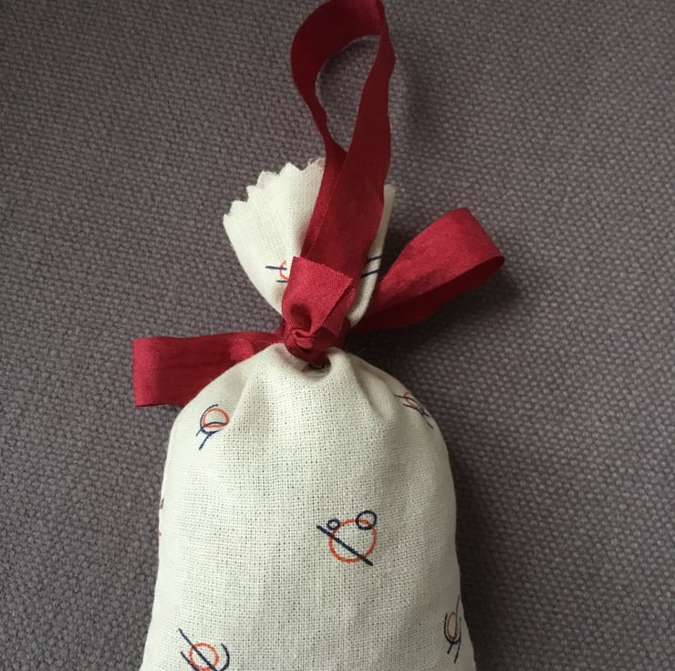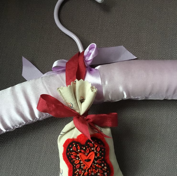 This lavender bag is tied with a dark red ribbon, with a hanging loop on the back....to hang on a coat hanger in the wardrobe, to hang on a door handle in the home or, to put in a drawer with clothes.