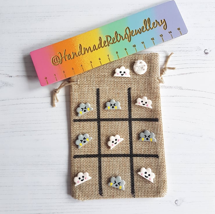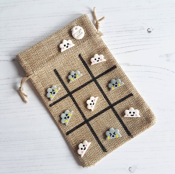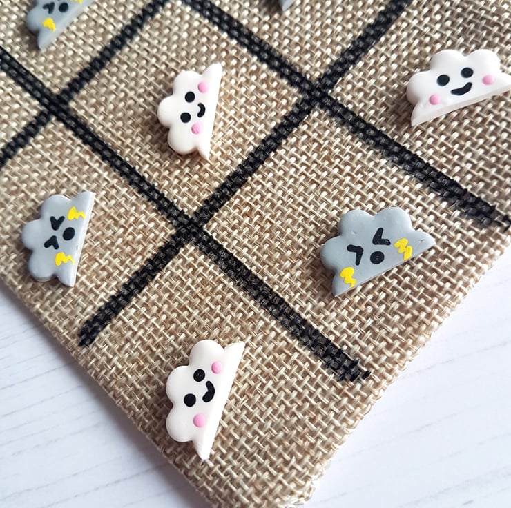 A new version of my popular tic tac toe sets, this one features white smiley happy clouds, and grey storm clouds with lightning bolt cheeks!!!