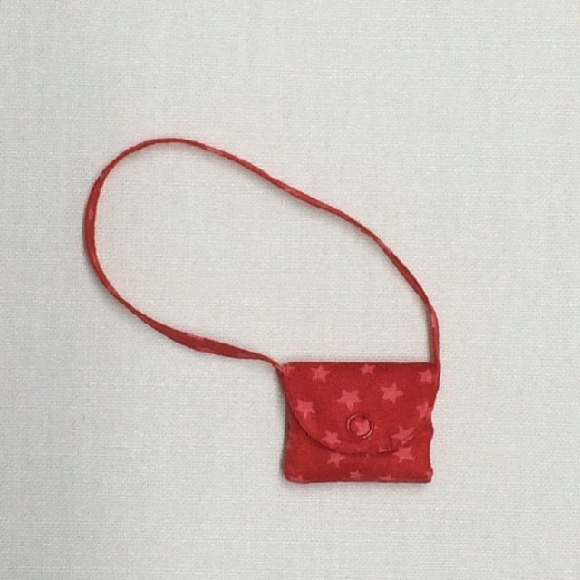The red bag (which matches her shoes) is made from cotton and is fastened with a red stud so that treasures can be kept inside.