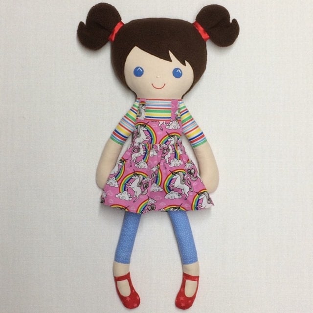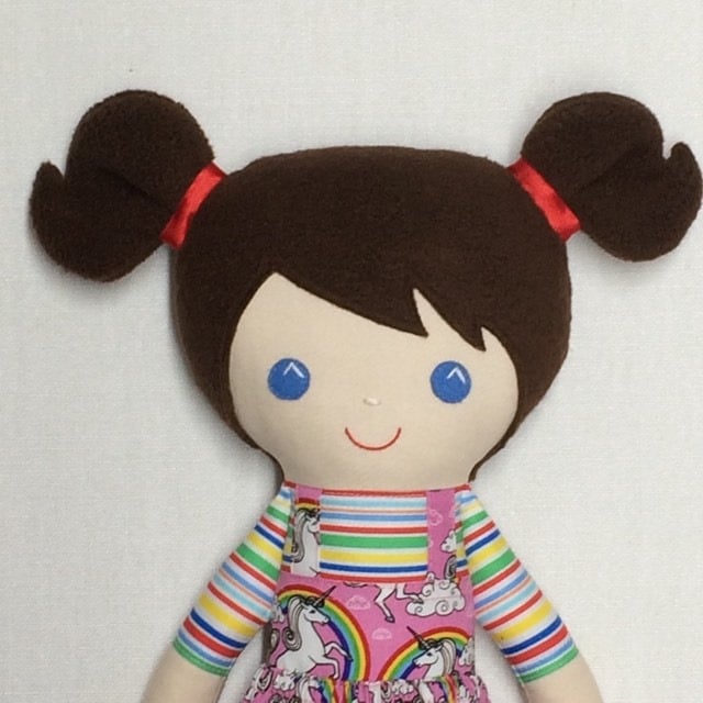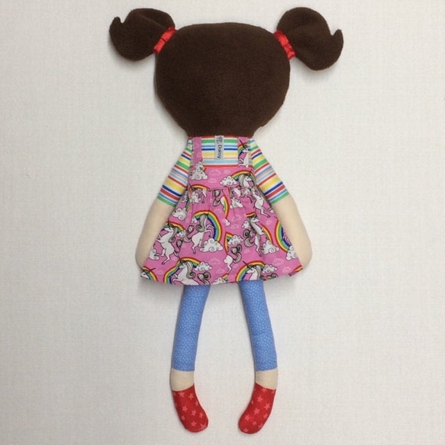 This Daisy doll loves Unicorns and is delighted with her new dress which is covered in them.