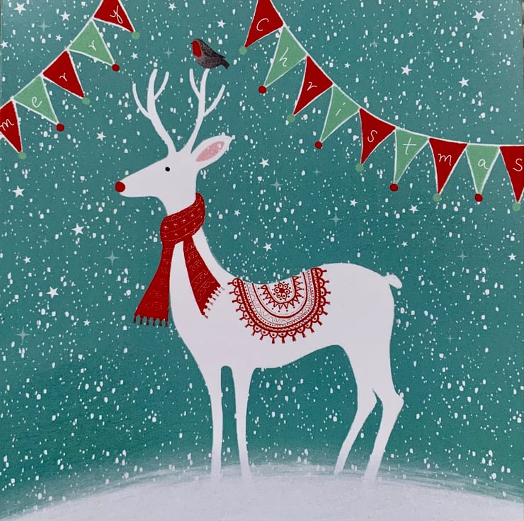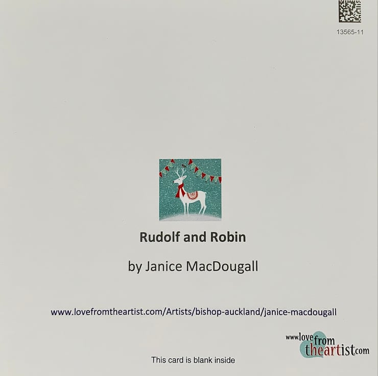 This is a blank greetings card created from one of my original paintings, featuring Rudolf and a robin. This is 14.5x14.5cm. It comes with an envelope