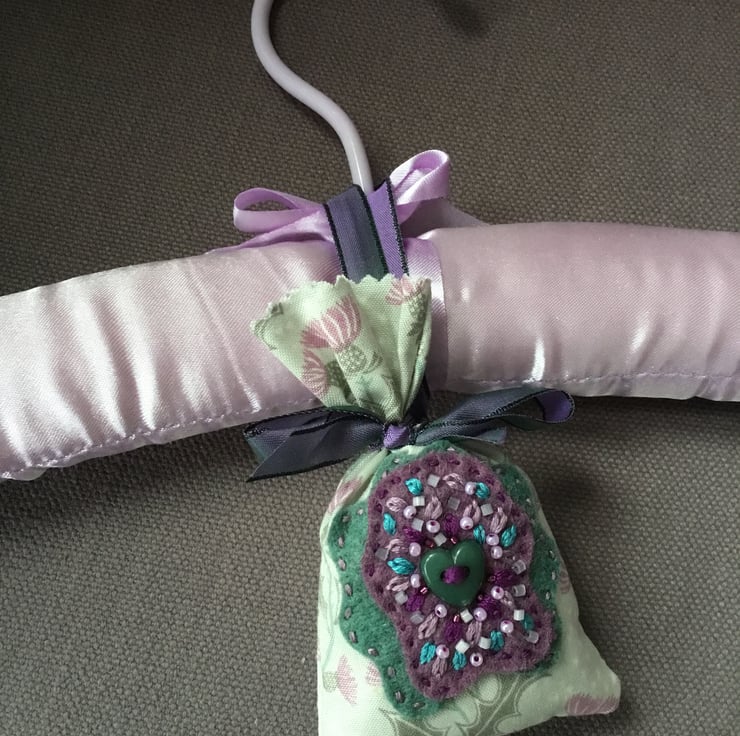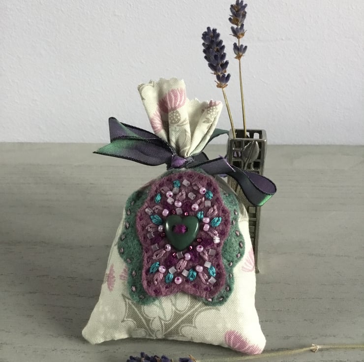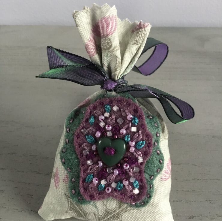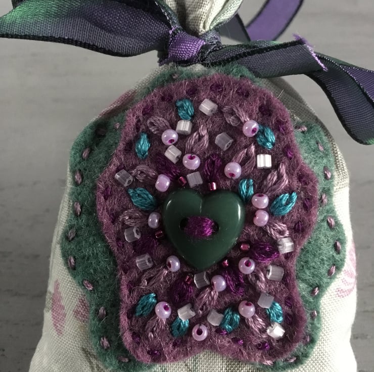 This lavender bag has a Scottish feel, it’s made out of cotton fabric with a pink and green design of the Thistle, a plant associated with Scotland. A hand embroidery in purple, pink, turquoise, threads and beads is stitched around a green heart shaped button, onto a background of jade green and purple felt.
