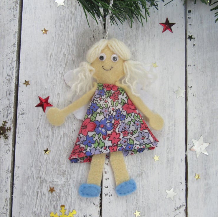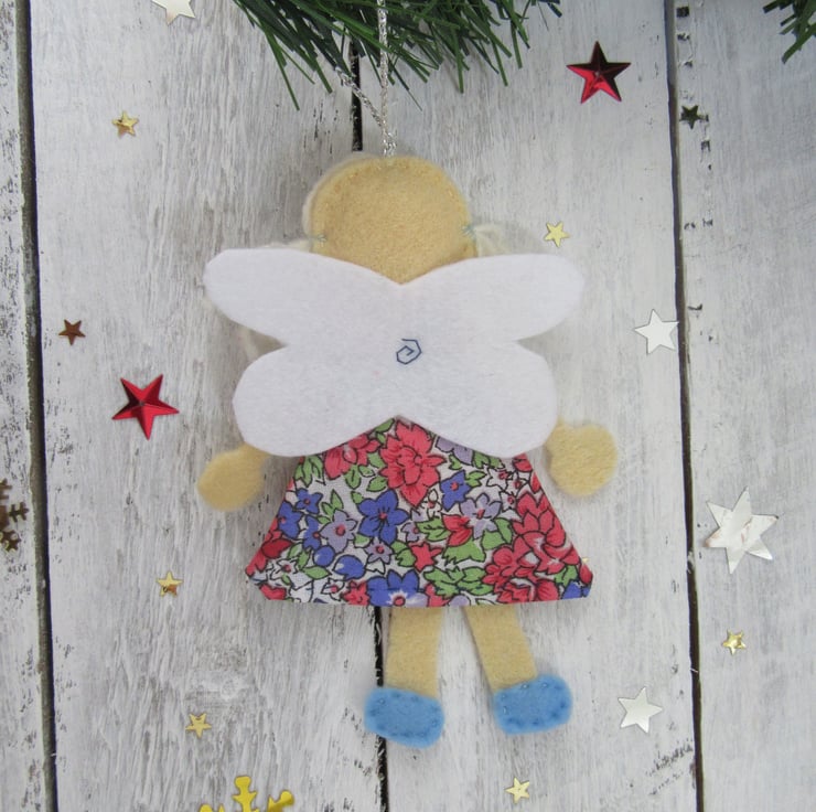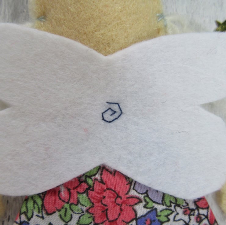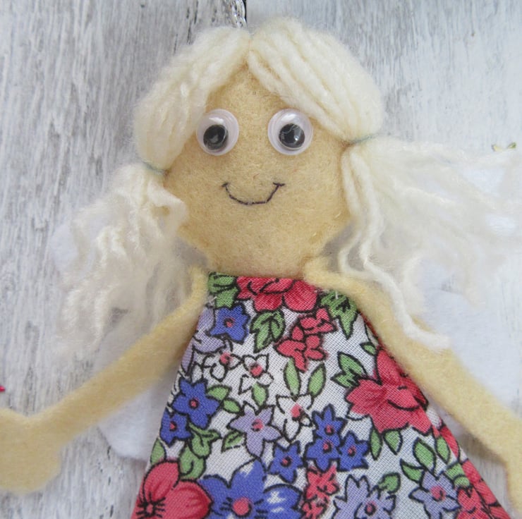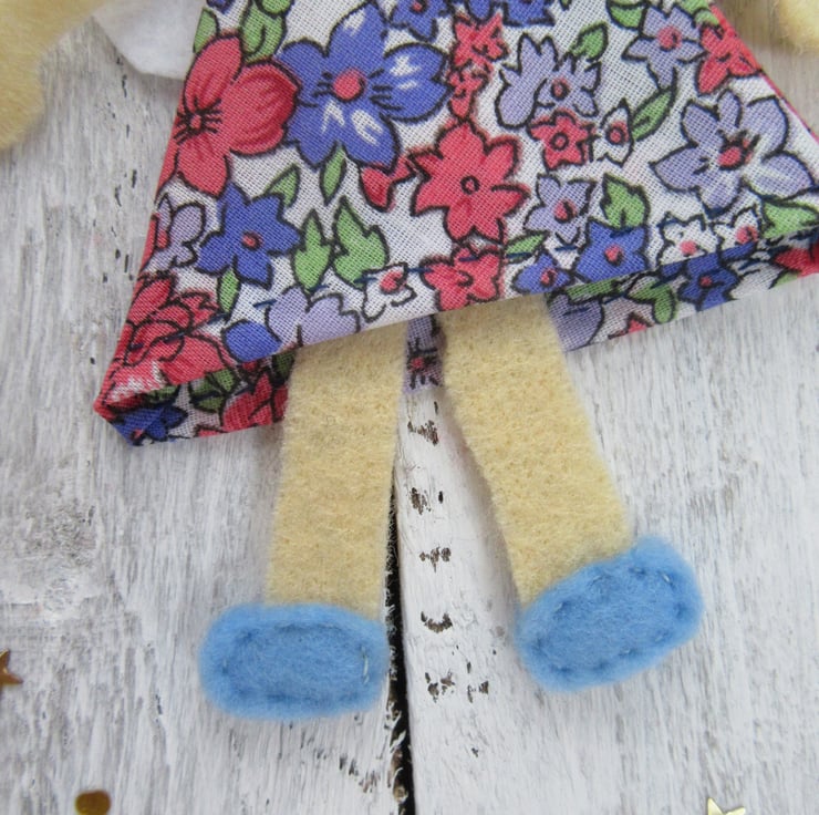 Each angel is made from fabric scraps, a cream acrylic felt head, arms and legs. This one is wearing a flowery patterned dress, with light blue felt shoes.