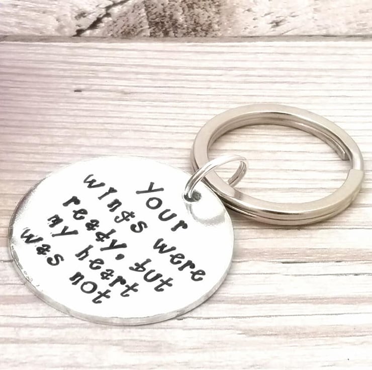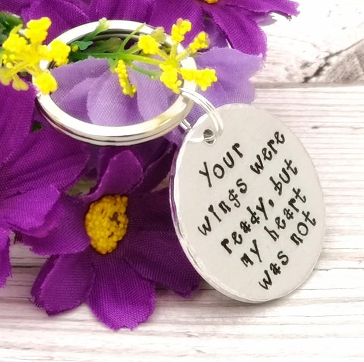 This metal keyring will be made to order by hand stamping each individual letter onto a blank aluminium disc. It is then polished and finished by painting each letter with black ink.