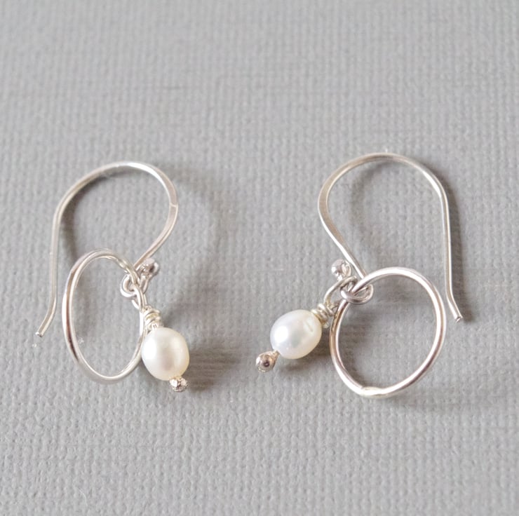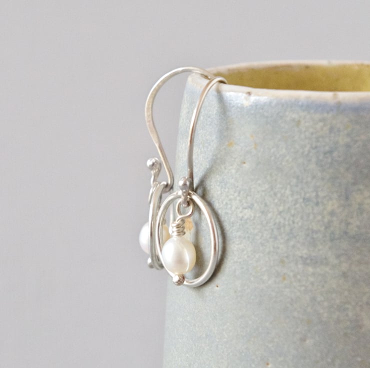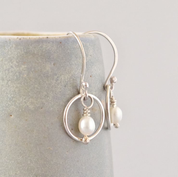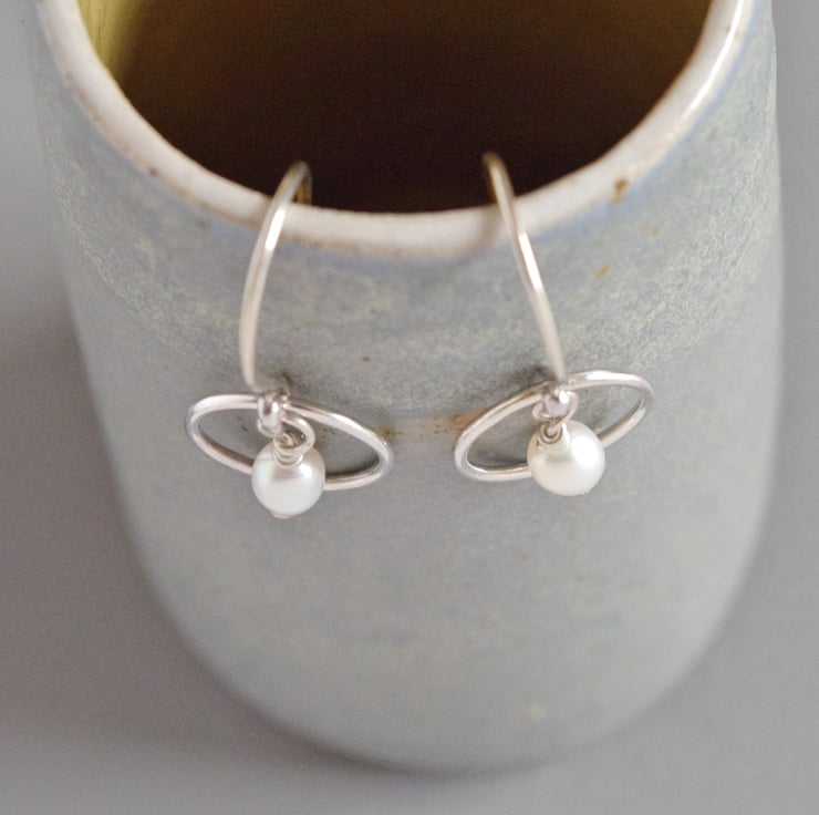 These minimalist drop earrings have been designed using simple geometric shapes. A lustrous white oval freshwater pearl drop is suspended within a perfect circle of sterling silver to symbolize the cycle of the year and of the moon and also the principle of karma: what goes around comes around. I have made all of the sterling silver wirework myself from the raw materials, including hand crafted head pins and ear fixings, in my West Sussex workshop. The earrings have been polished to a mirror shine for additional sparkle. Each earring measures approximately 30 mm or 1 1/16" long and is lightweight and easy to wear. The final photograph shows the earrings next to a vintage lipstick case measuring 3" long, in order to give you a sense of scale.