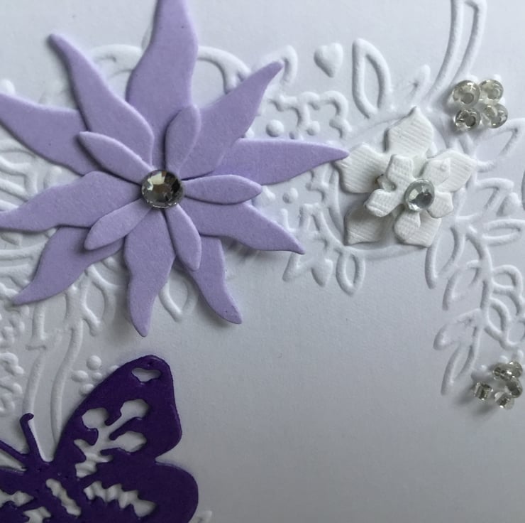 This lovely embossed card features handmade flowers, hearts and butterfly with an added bit of sparkle.