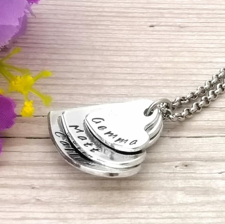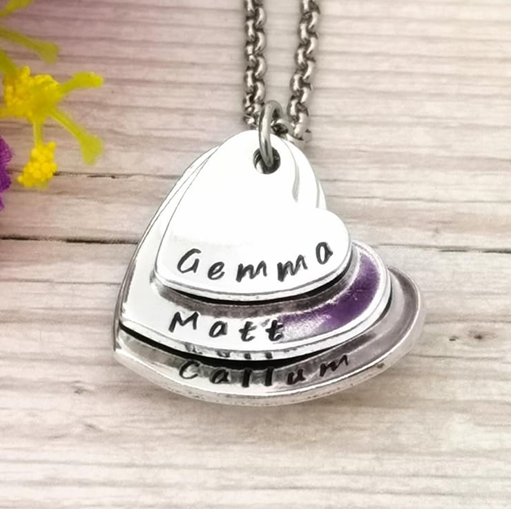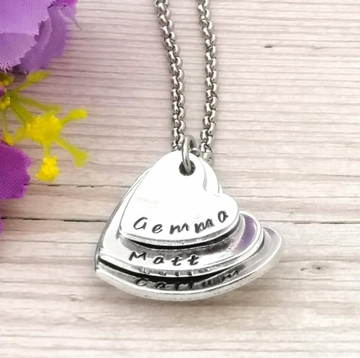 Personalise this beautiful stacked and domed heart pendant with three names, words or dates.