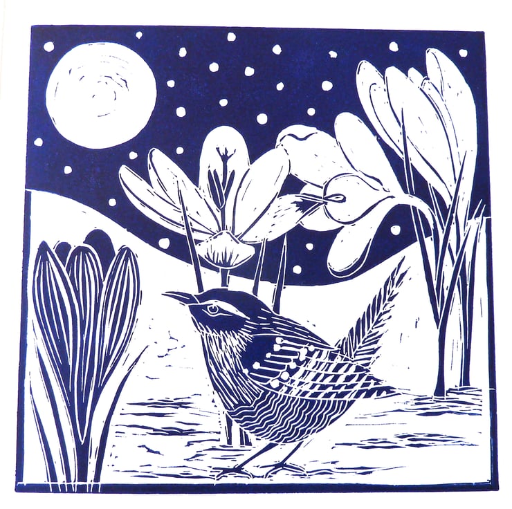 It features an inquisitive Wren sitting beneath the Crocus , keeping shelter from the gently falling snow under the full moon.
