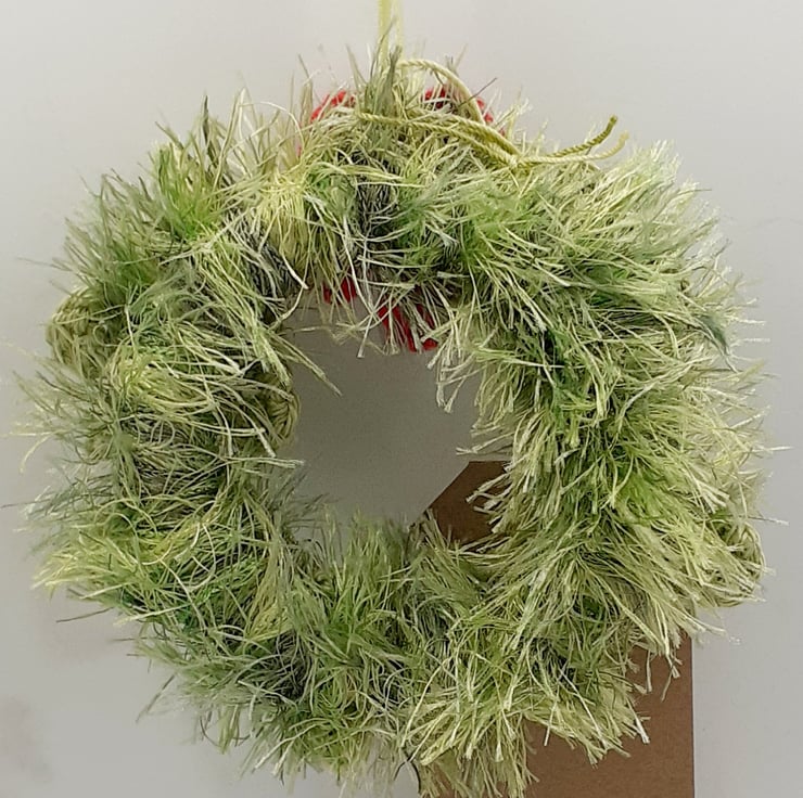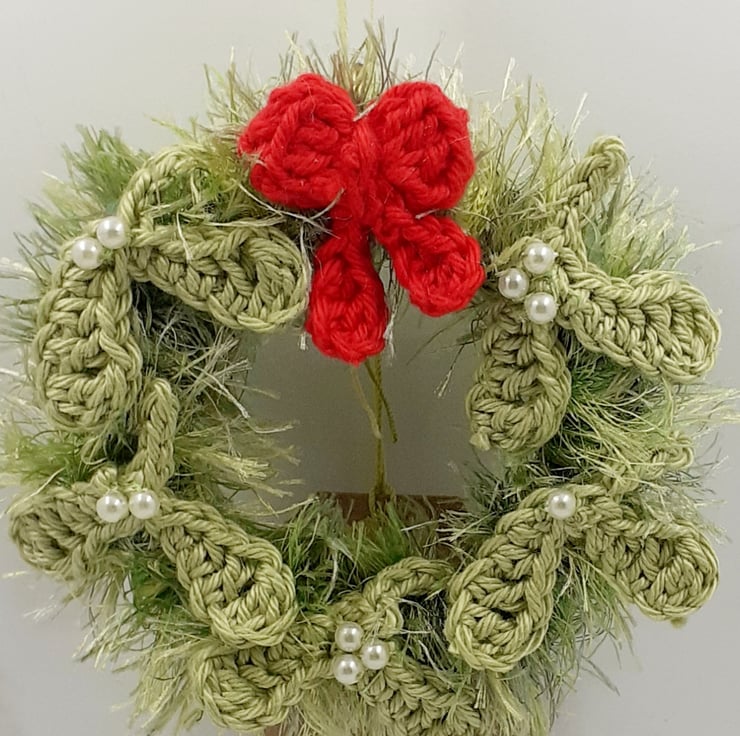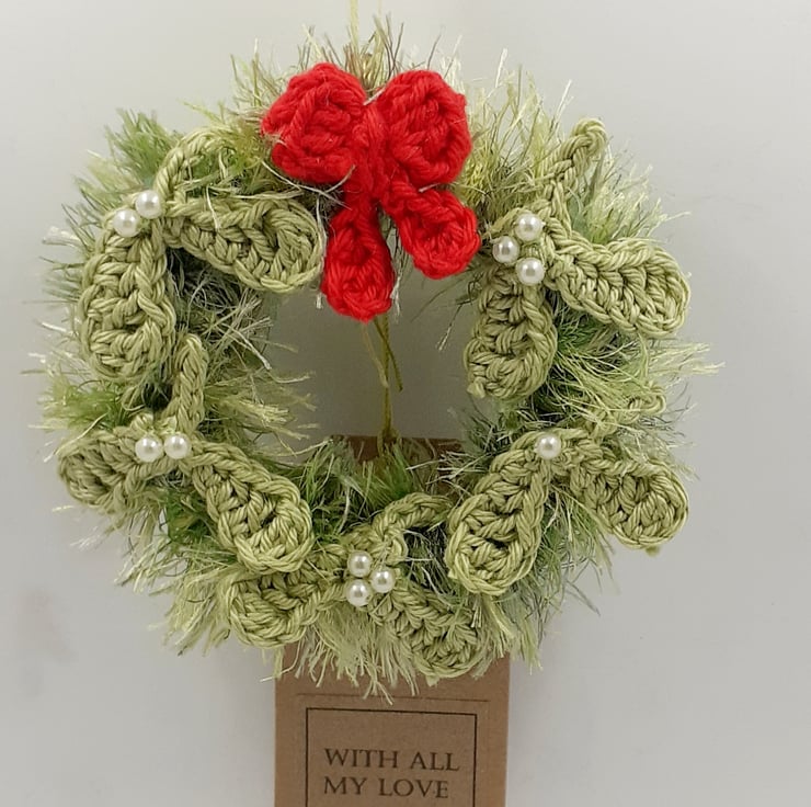The wreath is made from a wooden ring which has been wrapped in eyelash yarn and decorated with crochet mistletoe. The mistletoe has faux pearl beads for berries has wooden beads for berries.There is a cheerful crochet bow at the top and a narrow ribbon hanging loop. The wreath measures approximately 8.5cm in diameter. The tag reads With all my Love although I am very happy to exchange this tag for one with wording of your choice.