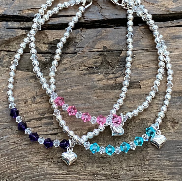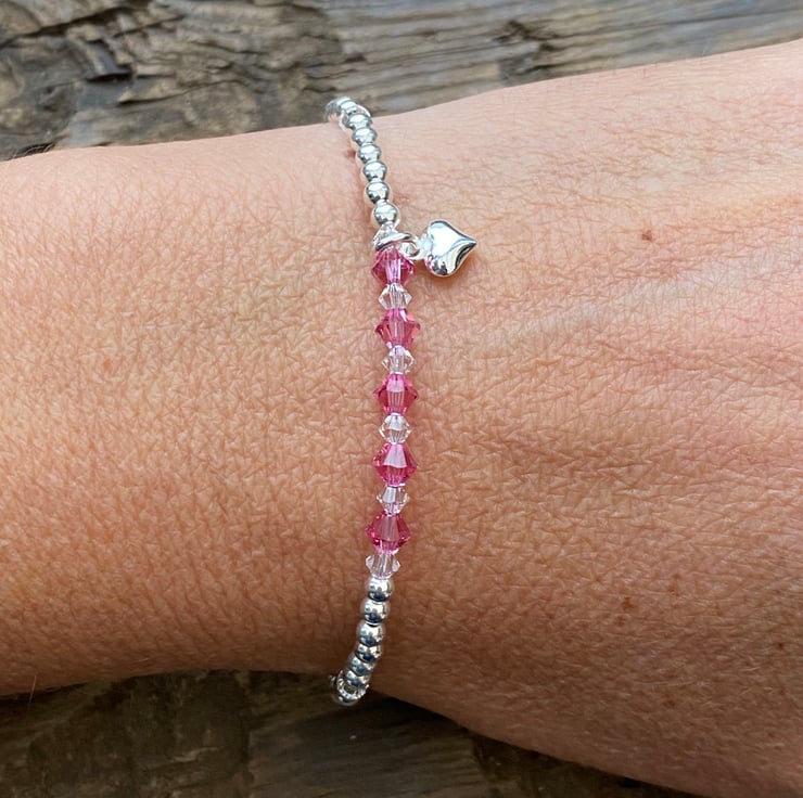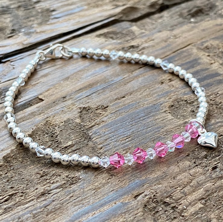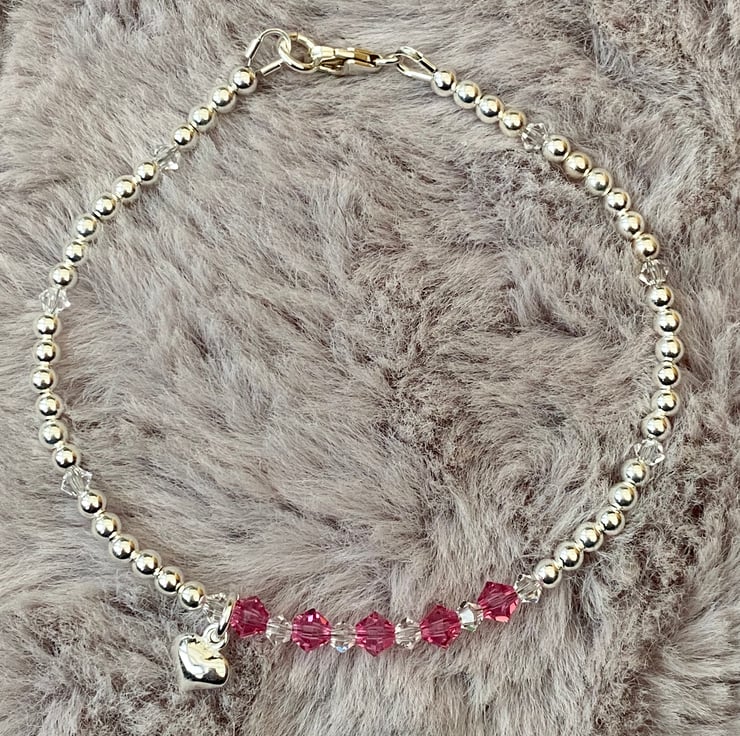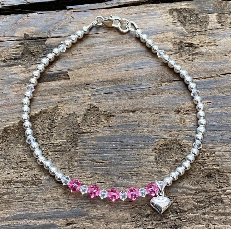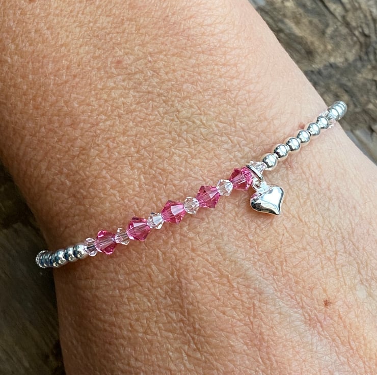 Made using 3mm sterling silver beads, 3mm clear Swarovski crystals and 4mm rose pink Swarovski crystals, and finished with a 6mm sterling silver puffed heart charm.