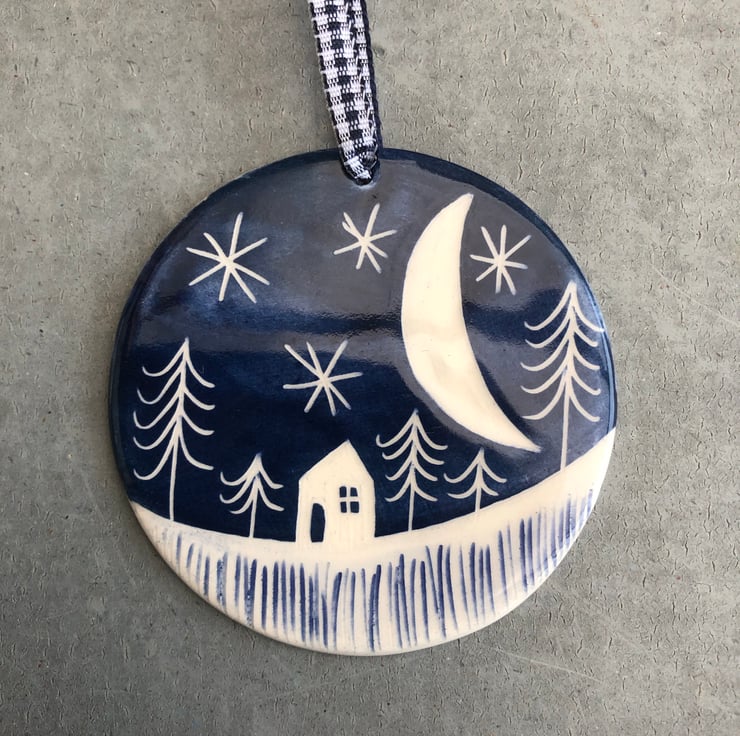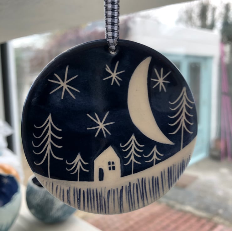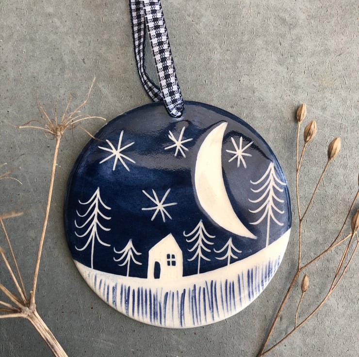Each decoration is hand made from white earthenware clay, decorated with coloured slips and a hand drawn scraffito design. Gingham ribbon is attached to allow the decoration to be hung.