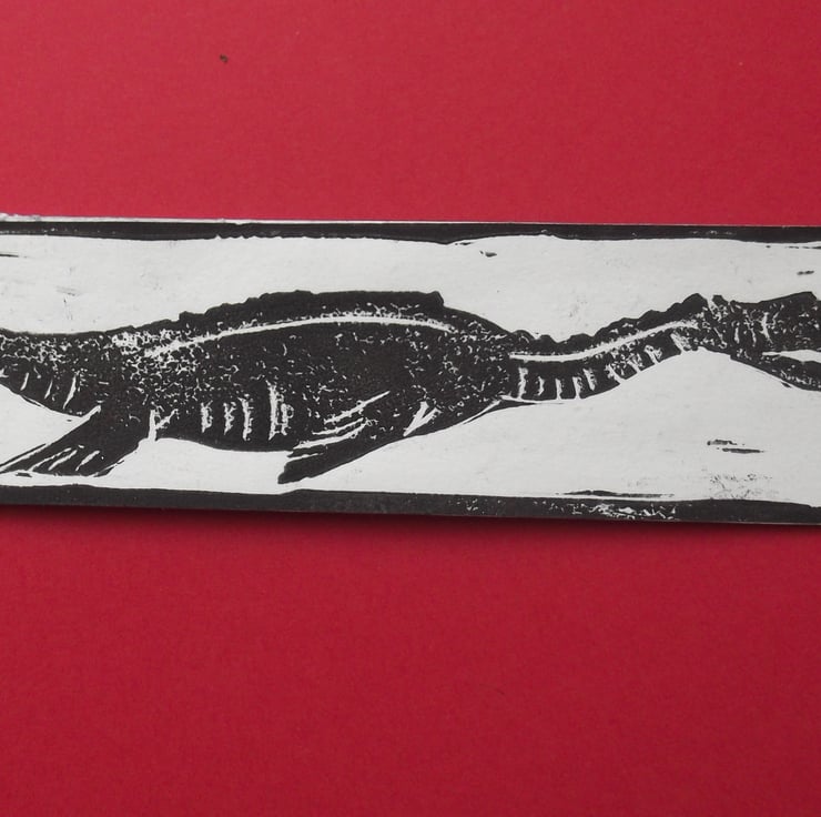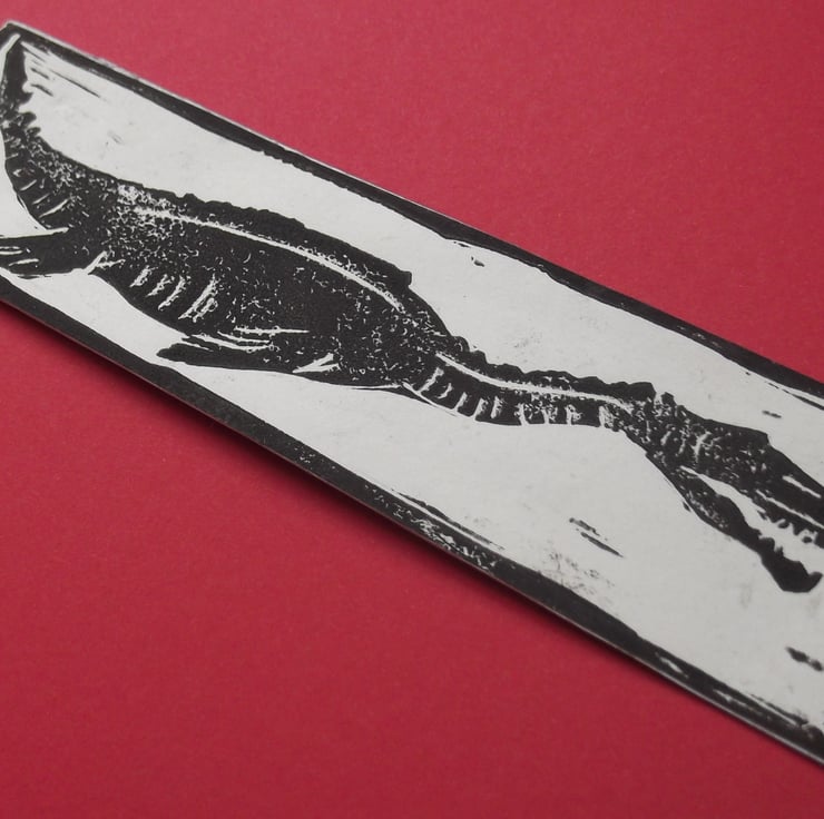 A double sided bookmark featuring a prehistoric creature of the marine variety.