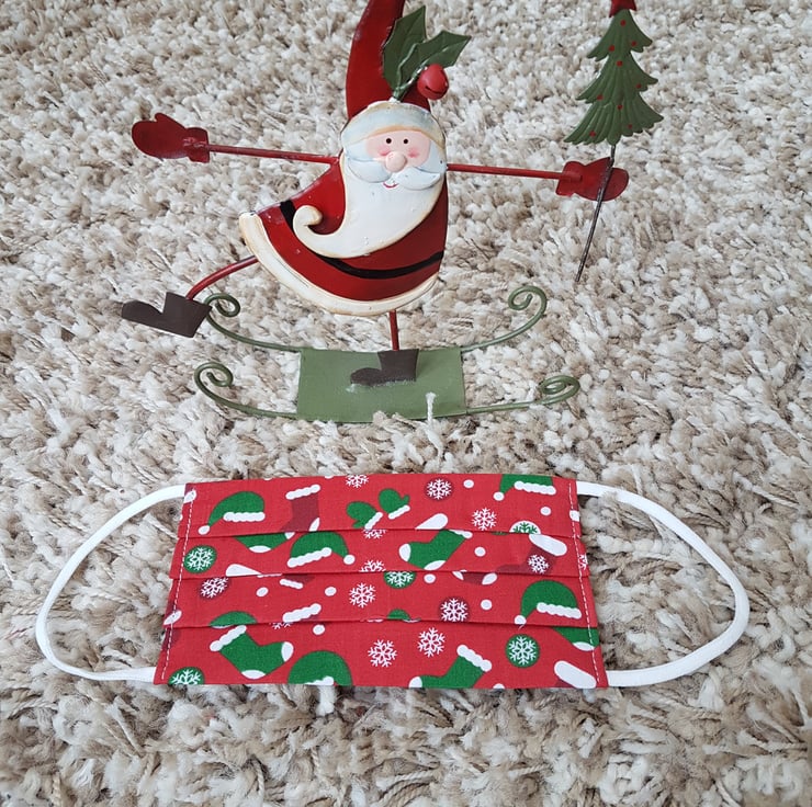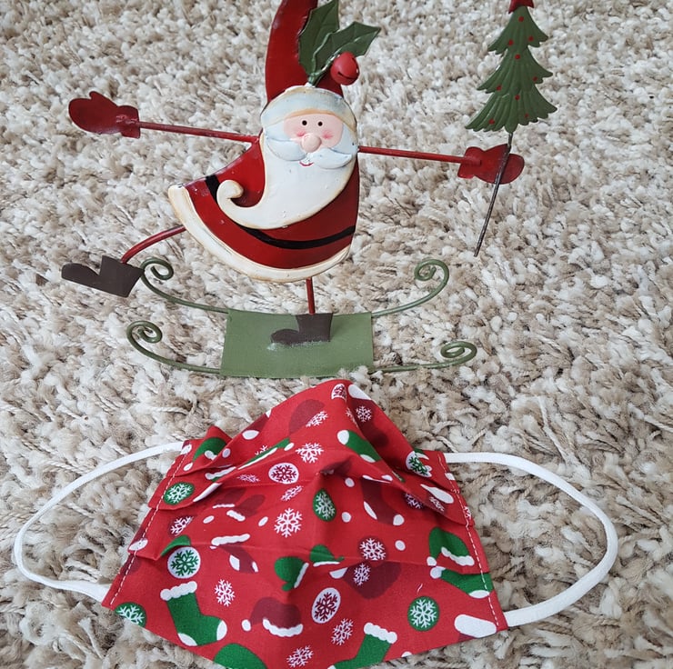 Adult festive face covering made from a hat and mittens print. The face mask is made with 2 layers of cotton forming an inner pocket for a filter (not included) and is fastened over the ears with 2 loops of elastic and a toggle adjuster.
