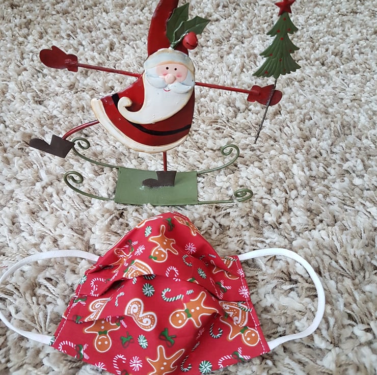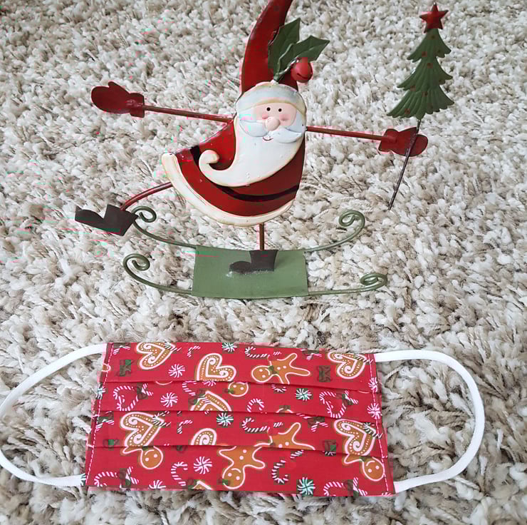 Adult festive face covering made from a gingerbread man print on red cotton. The face mask is made with 2 layers of cotton forming an inner pocket for a filter (not included) and is fastened over the ears with 2 loops of elastic and a toggle adjuster.