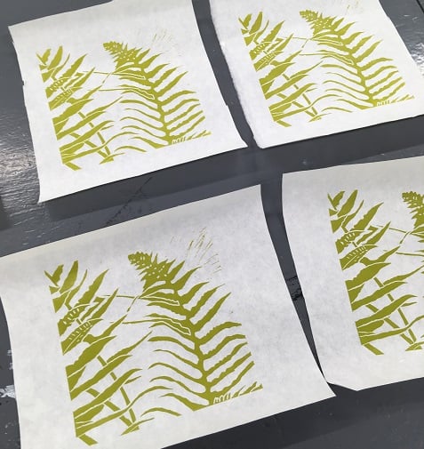 I hand carved my 'Ferns' design into a linocut block and printed in a light green vegetable oil based ink onto beautiful ivory kozo paper. My printed paper was then mounted onto grey board covers.