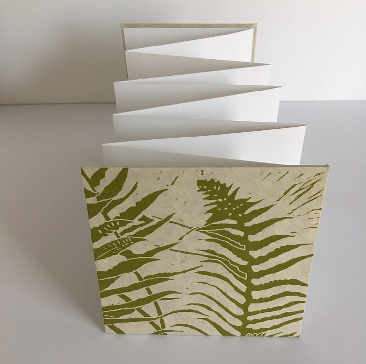 Concertina, accordion sketchbook / notebook covered with one of my Fern handprinted linocut designs.