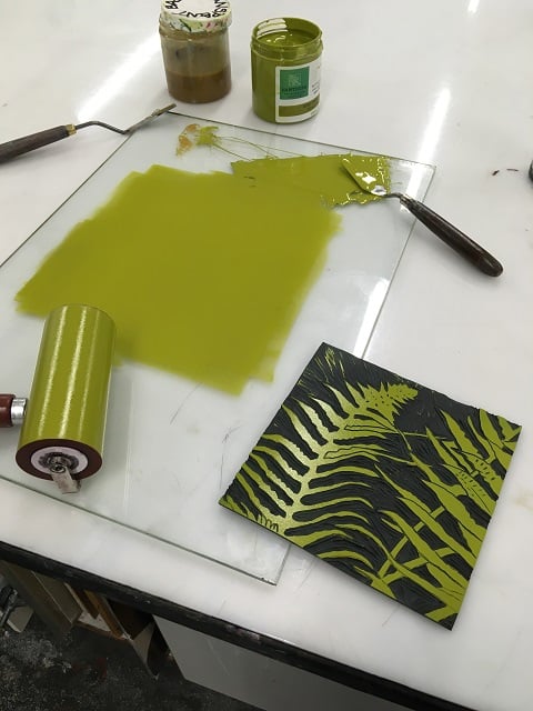 I started with making a watercolour painting of delicate, fresh ferns and took this for inspiration to carve my design onto the lino block. Then I hand printed onto Japanese kozo paper to make the covers for this book, in this lovely light green colour with vegetable oil based printing ink.