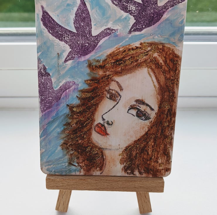 An ACEO - art card, editions and original artwork of a lady's face and geese.