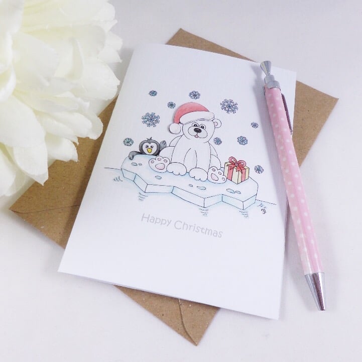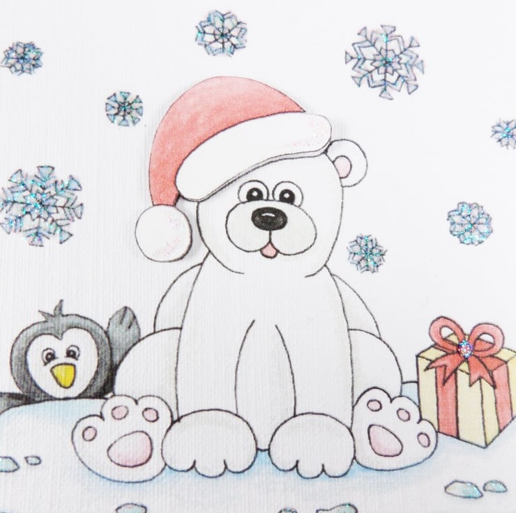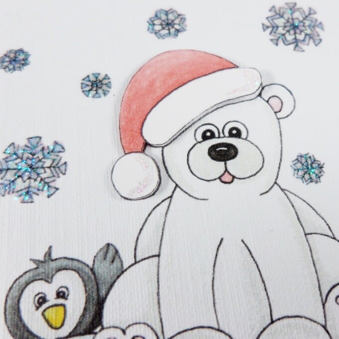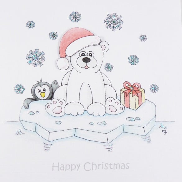 This cute polar bear & penguin card has been designed using my own original watercolour illustration. The card has been printed out onto good quality linen embossed card and decoupaged up in parts. The card has been finished off with a little glitter detail.