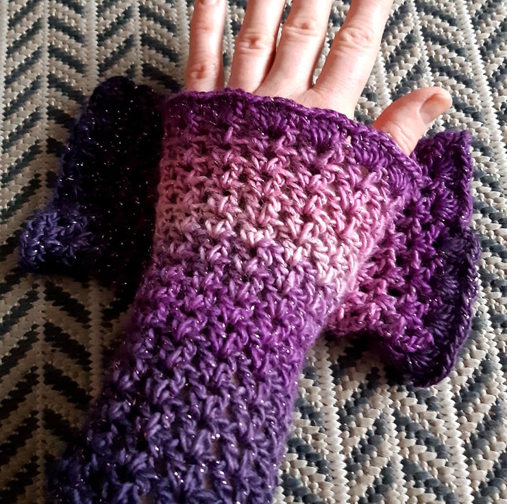Crochet wrist warmers in shades of sparkle purples