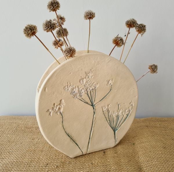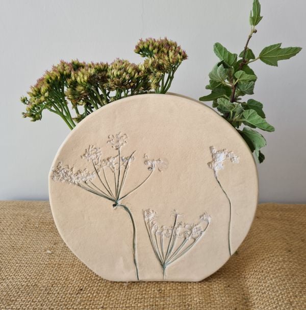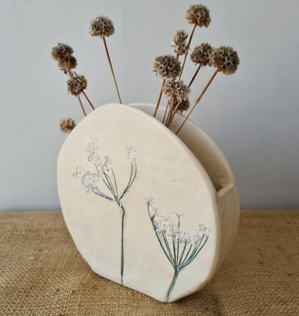 Handmade in my studio, this one-off ceramic vase has been hand built using stoneware clay. Real flowers are impressed into the surface, preserving their natural beauty forever.