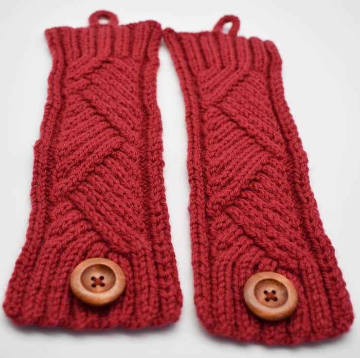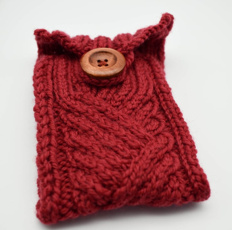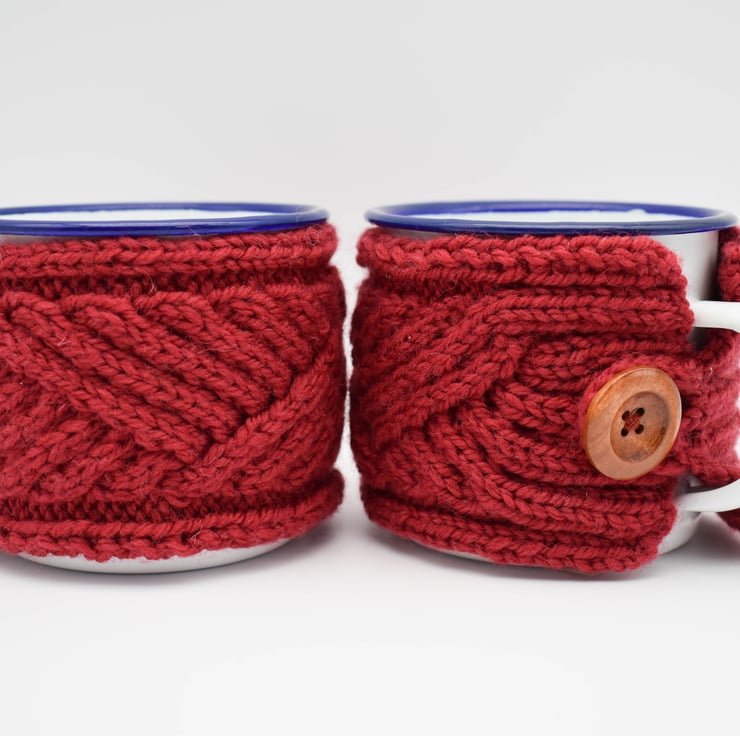 These hand knitted mug cosies are made with squishy brick red merino wool and are knitted in a complex braided pattern, which fastens at the handle with a wooden button for ease of fitting and removal.