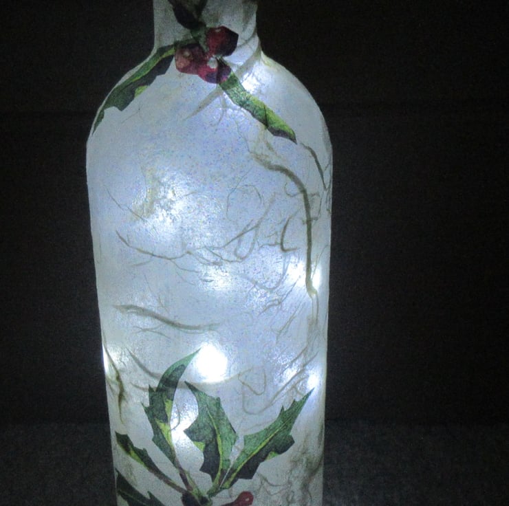 The bottle can be used with fairy lights or with a USB light as shown in the photos - the USB "cork" light or the fairy lights are can be added for an addition cost - please select the variation or contact me. The fairy lights come with an AA battery and are easily switched on/off.