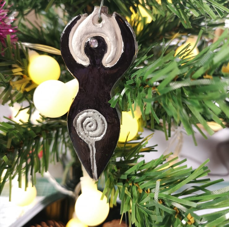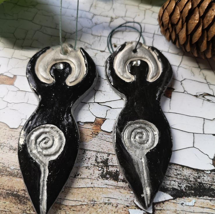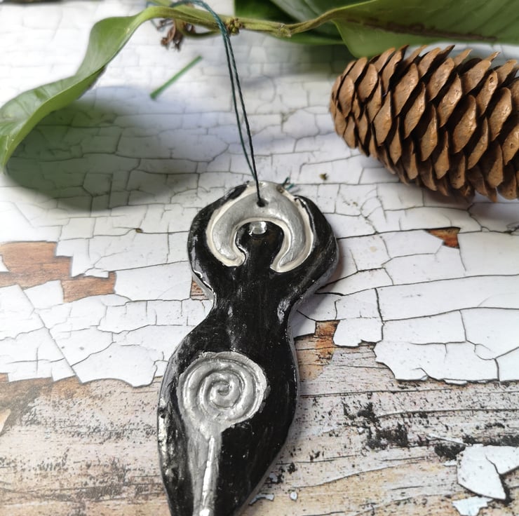 Gorgeous black hanging Goddess with silver moon crown and diamanté 3rd eye, with silver spiral. She is a stunner.