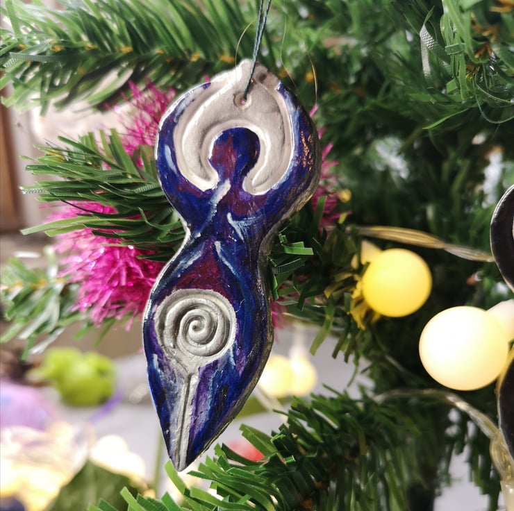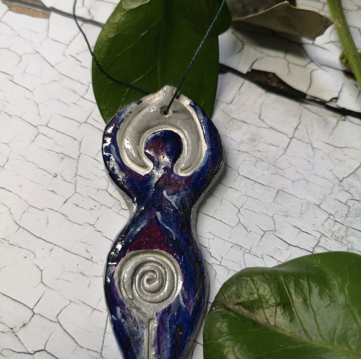 Gorgeous dark blue Goddess with a silver moon crown and silver spiral. Peaks and troughs are painted into the blue creating a subtle effect.