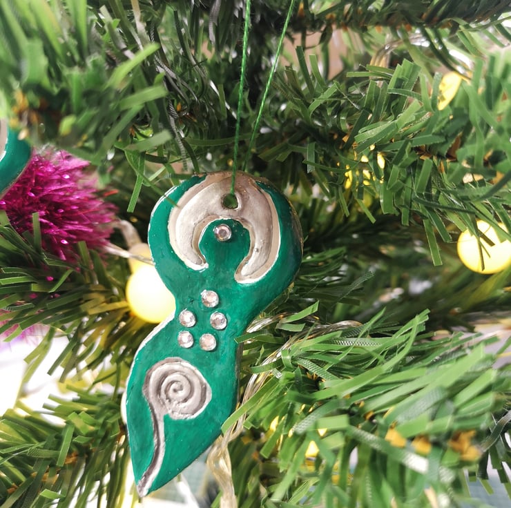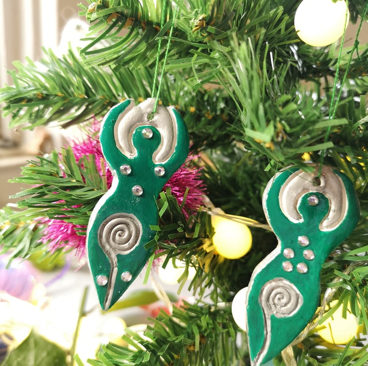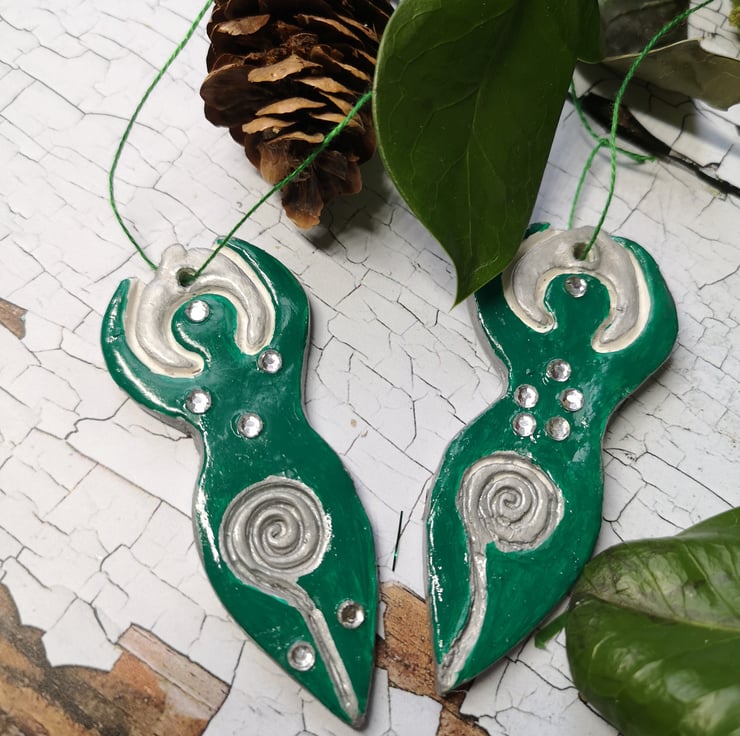 Beautiful verdant green Goddesses with silver moon crowns, silver spirals and decorated with diamanté studs.