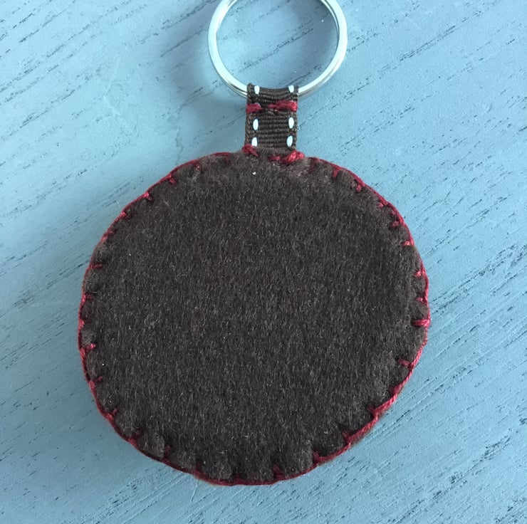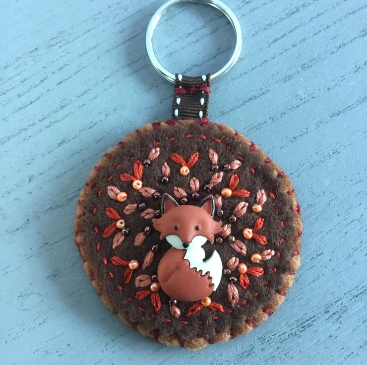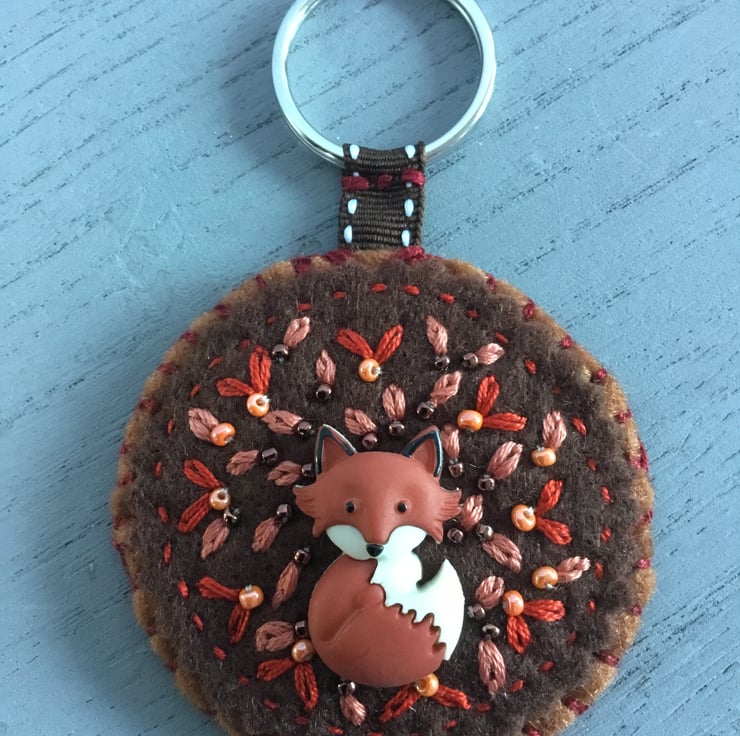 The cute Fox button at the centre of this key ring or handbag accessory is stitched onto a background of brown felt. Leaves are hand embroidered in orange and peach lazy daisy stitches, dotted with orange and brown beads.....so it looks like the Fox is sitting in a pile of Autumn leaves. This circular scene is attached to a metal split ring to hold a key or, to put onto a handbag as an accessory, by cotton brown ribbon.