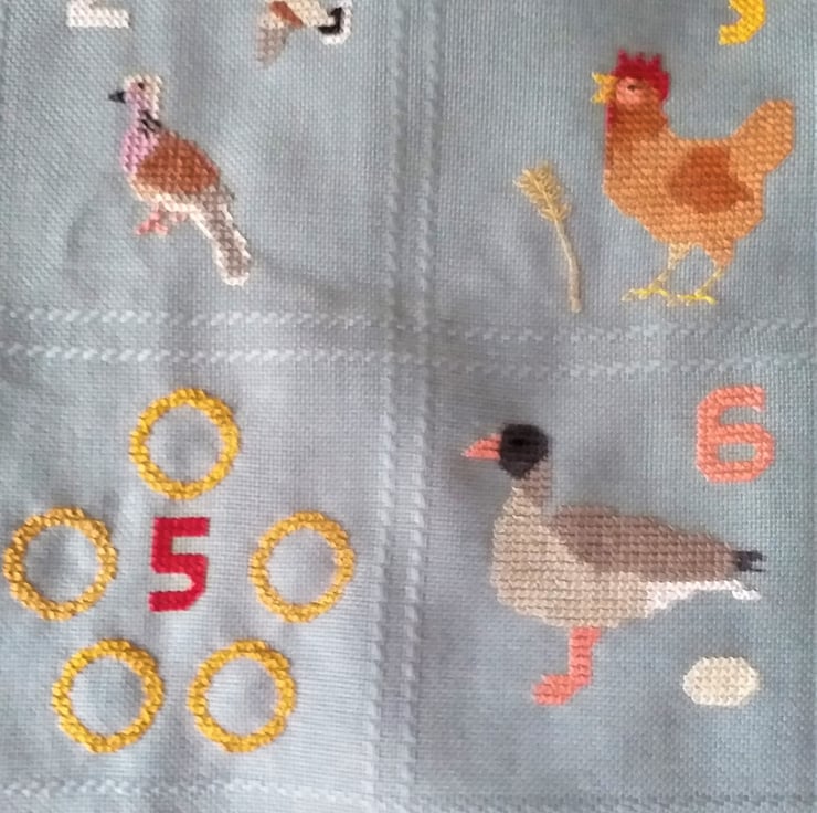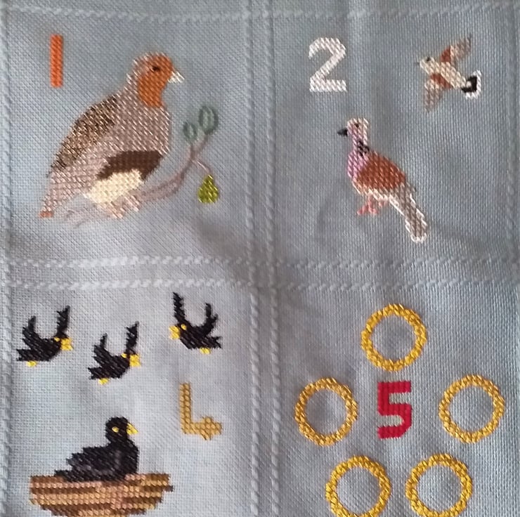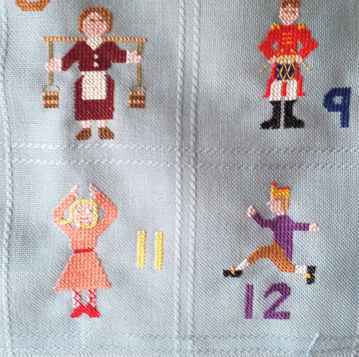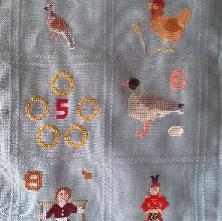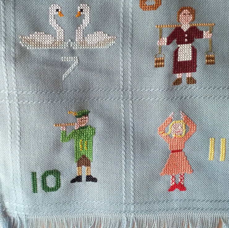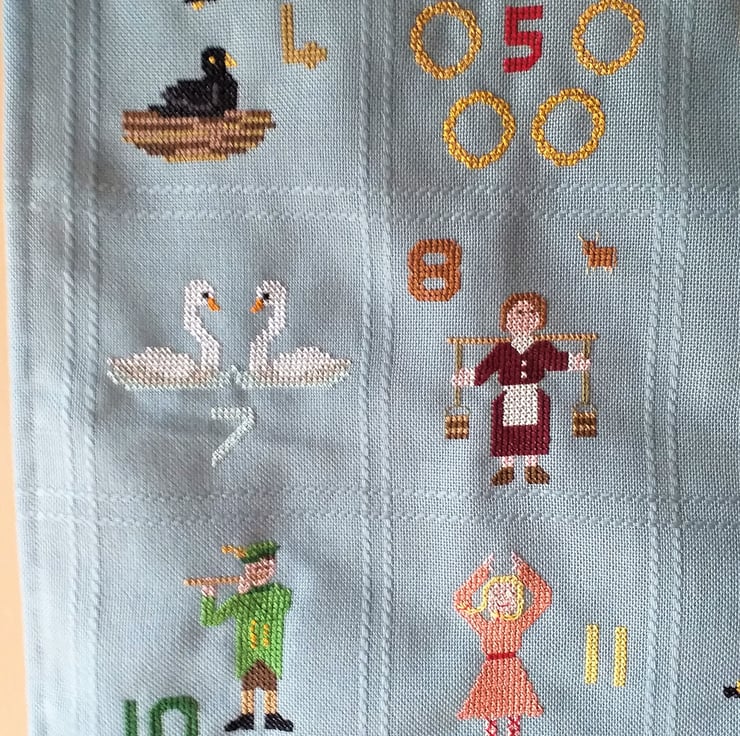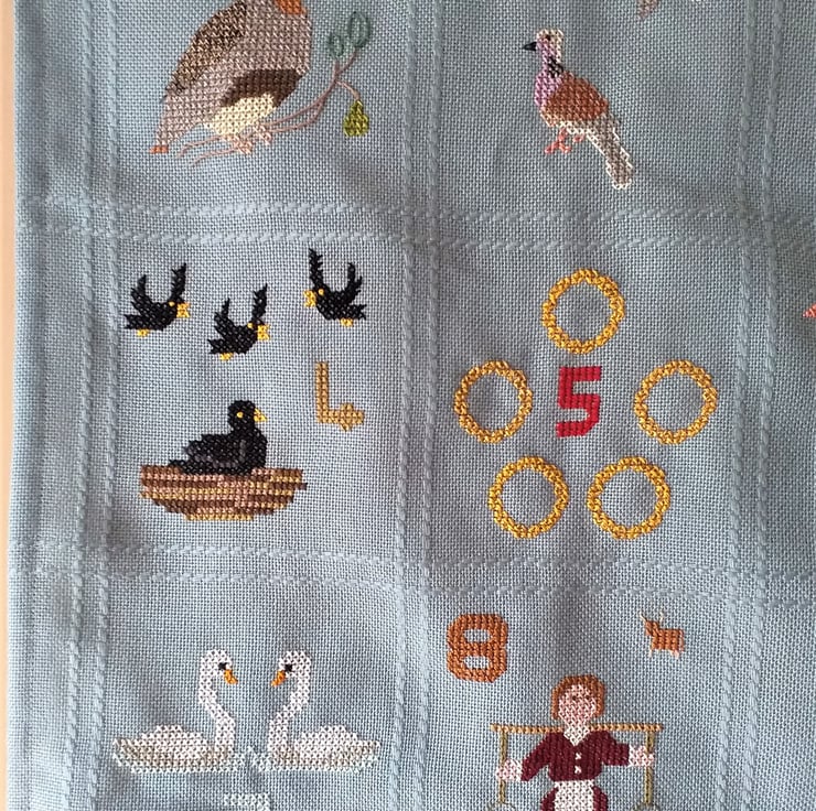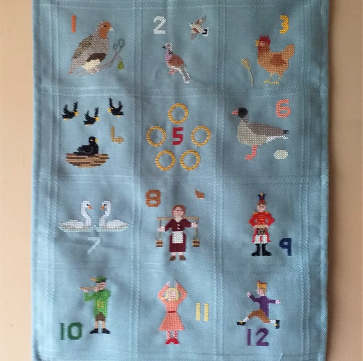 This is a beautiful hand-embroidered wall hanging (largely cross-stitch, though not entirely). It is all my own design, and unique. It depicts the Christmas song, the Twelve Days of Christmas, each day having a square of its own, containing an illustration and the relevant number. All the birds, the partridge, turtle doves, goose and French hens are as accurately represented as possible, given the limitations of the fabric and stitches. The five gold rings are stitched with a combination of stranded cotton and a metallic gold thread. All the rest of