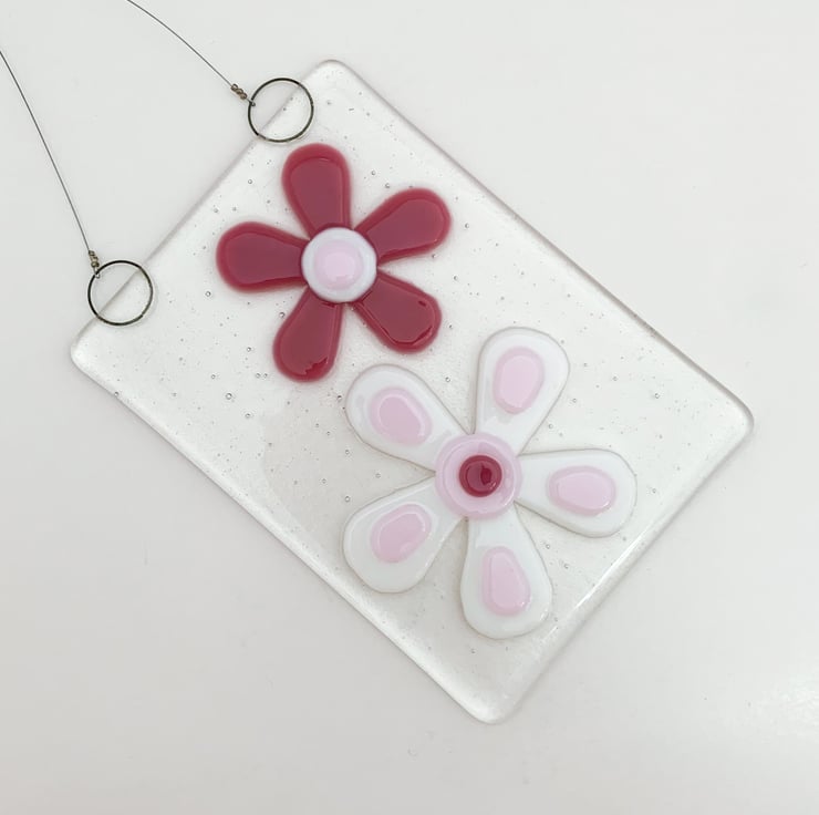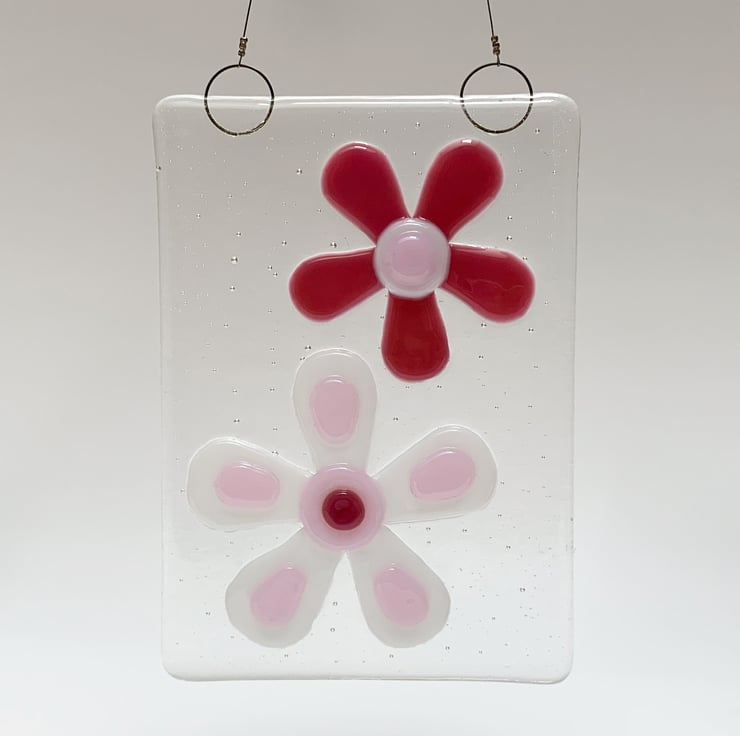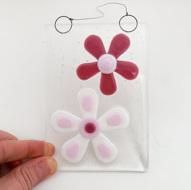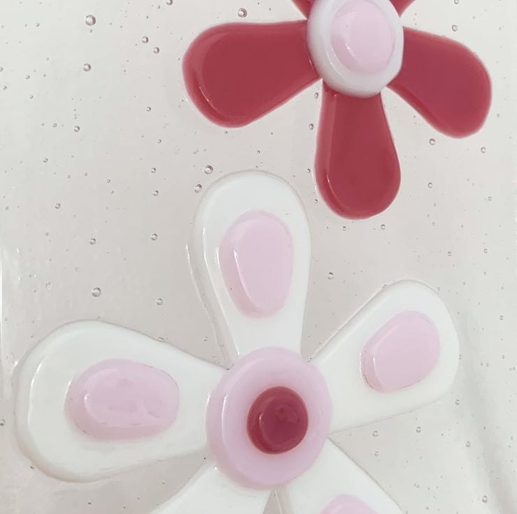 To make this, I cut 2 rectangles from transparent art glass and fused them overnight in my kiln. I have then hand cut and shaped pale pink, plum and white opaque art glass, making petal and circle shapes. I then arrange them on the pre-fired rectangle and fire the piece a second time to slowly tack fuse the flower into place. All glass is hand cut and assembled, therefore no 2 are exactly the same. One Supplied.