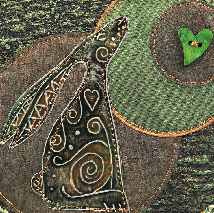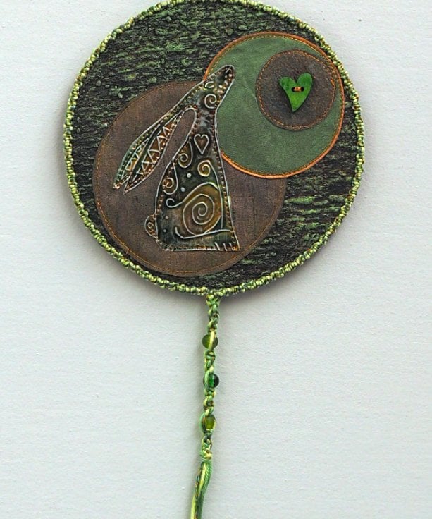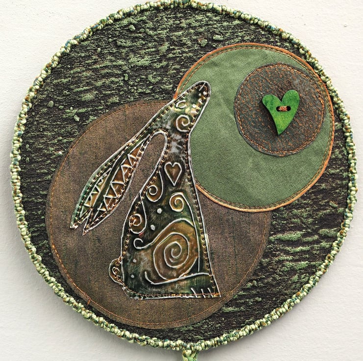 This Macrame Hare Moon Gazer measures 15cm diameter. 64cm long in total including the macrame hanging loop, edging and loose embroidery silks tendrils with driftwood and glass beads. It features an embossed metal hare of my own design stitched onto a painted fabric background. Single sided and stiffened on the reverse (plain black) to hold it's shape. The macrame and driftwood details are prepared and created by my sister Mandy at Thrifty Drifter.