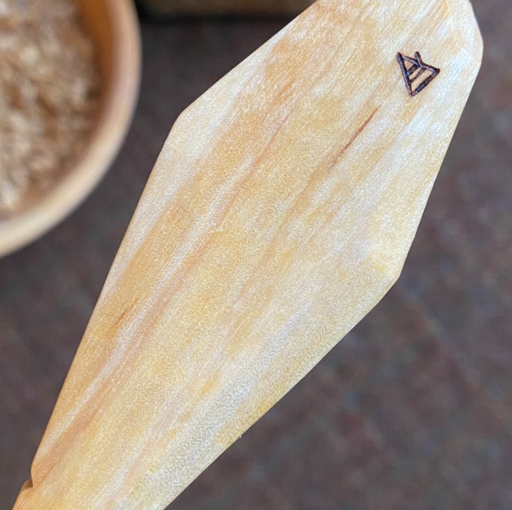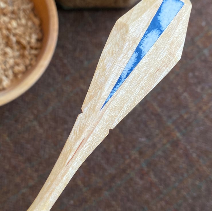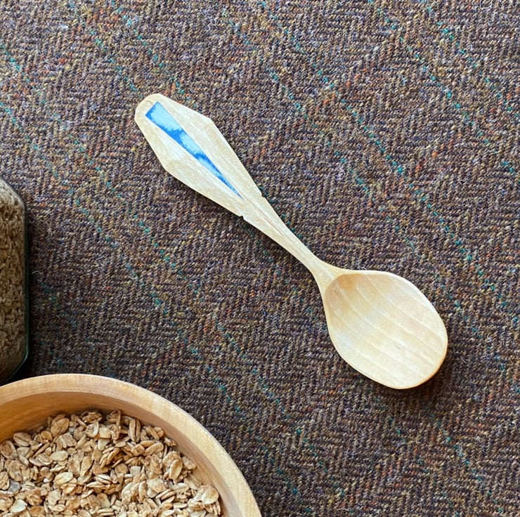 The spoon has been made from a freshly cut log, which was taken to its final shape using traditional methods- splitting the log firstly into a 'blank' by froe tool, drawing on a rough shape before axing this out and then finalising the shape using an array of knives. This leaves beautiful cut facets which mean no sanding is required. After drying, the spoon receives a final shaping by knife, before the handle is painted using food safe milk paint. The image on the handle is of blue sky and white puffy clouds of a summers day. The spoon is then burnished using a smooth Scottish pebble leaving a silky feeling to the wood. And finally the wood is then sealed using organic food grade linseed oil.