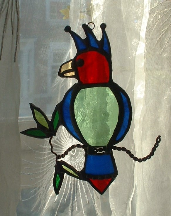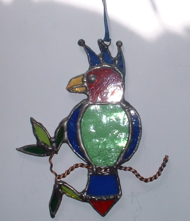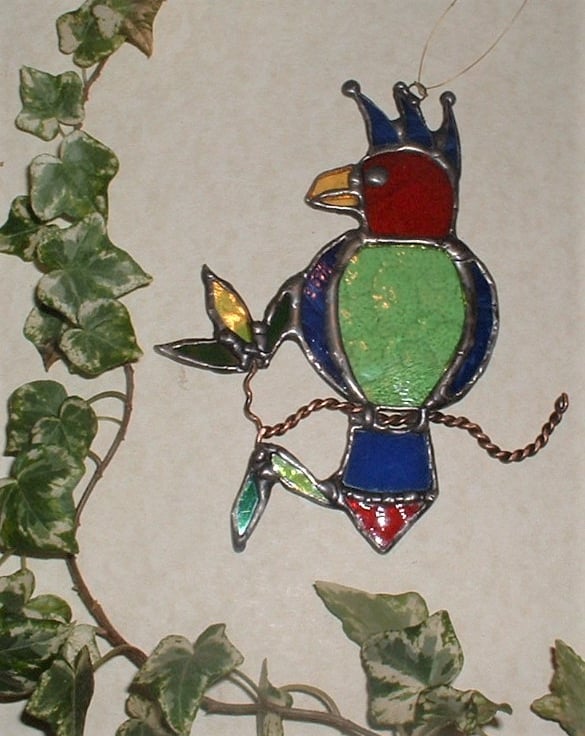 He is made from bright red, vibrant blue, light green textured glass with an orange beak and a twisted copper wire branch for him to perch on.