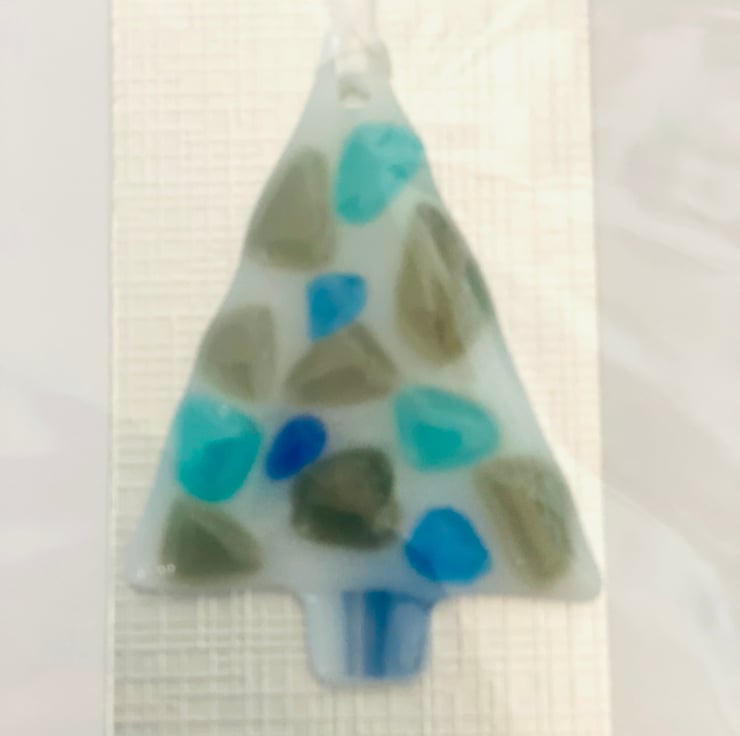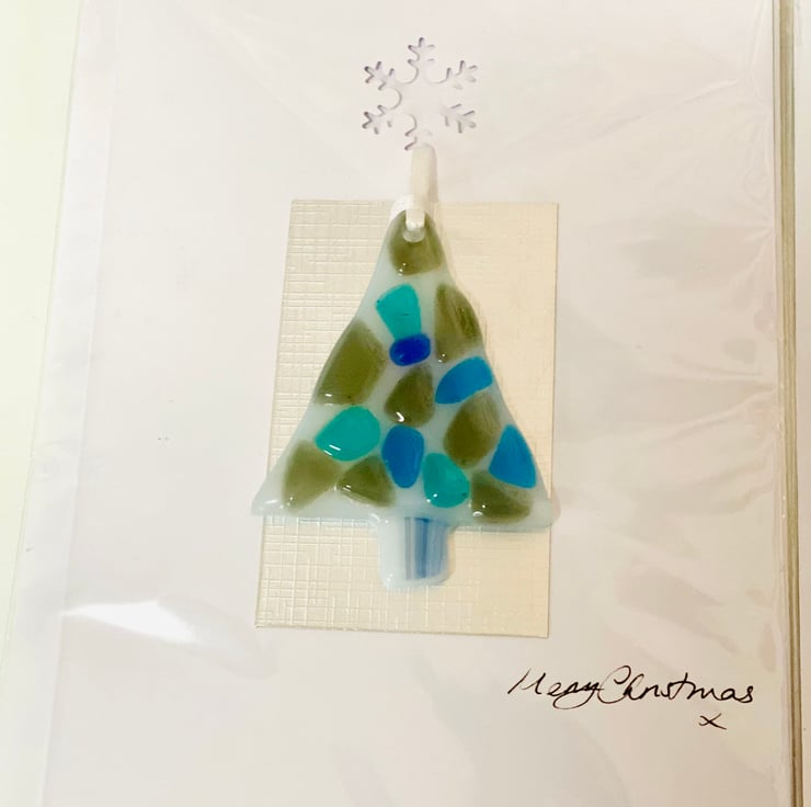 A card and a Christmas tree decoration in one . These mosaic Christmas tree look lovely in Christmas lights on your tree . The colours absorb the light. The free decoration measure 3 inch high and aprox 2 inch wide. The metallic card behind the decoration adds a little Christmas sparkle . The cards are blank so you can write your own message inside