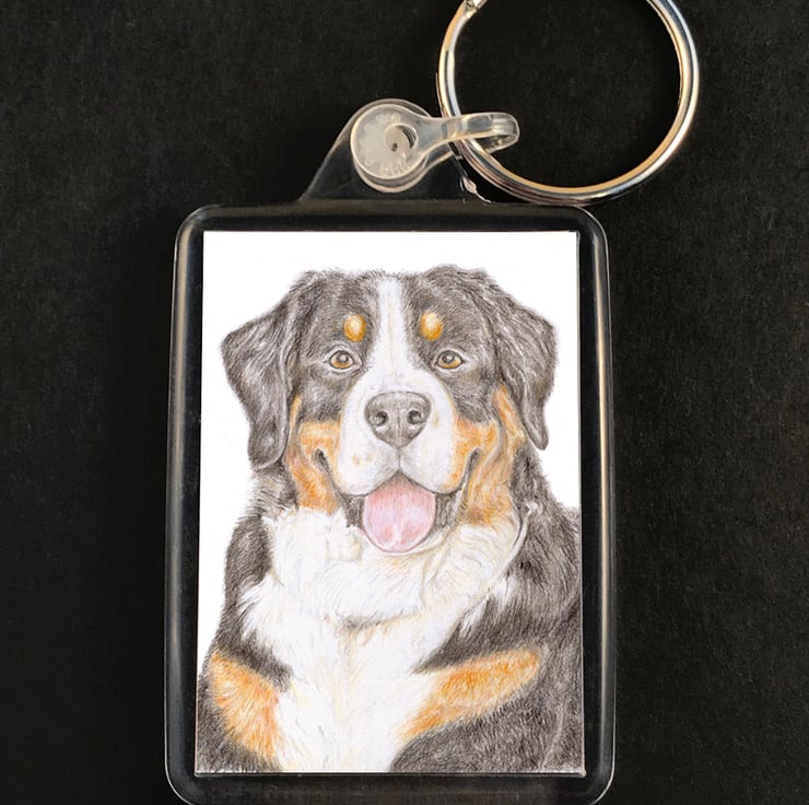 Loki the Bernese Mountain Dog. Print of hand drawn illustration by artist Paul Fry presented in an acrylic Keyring.
