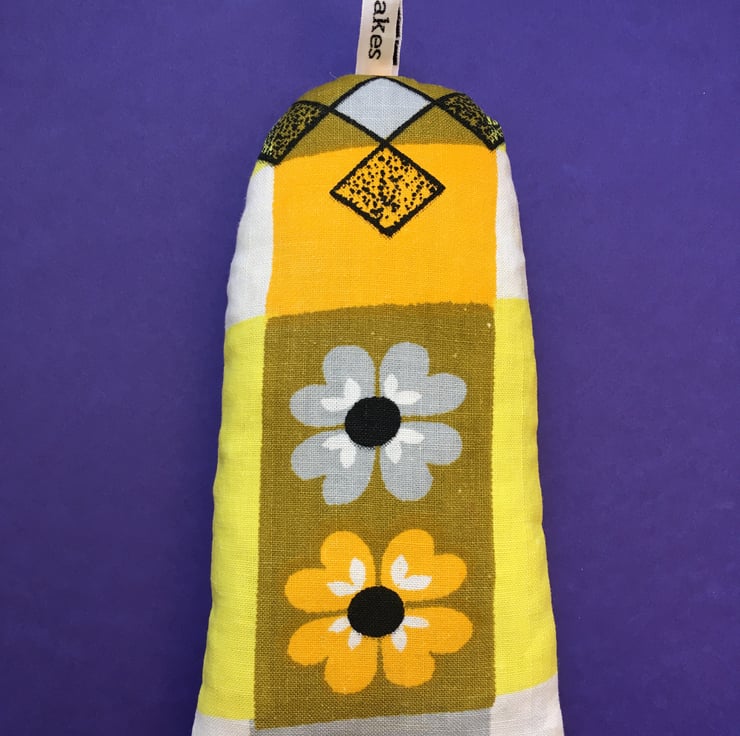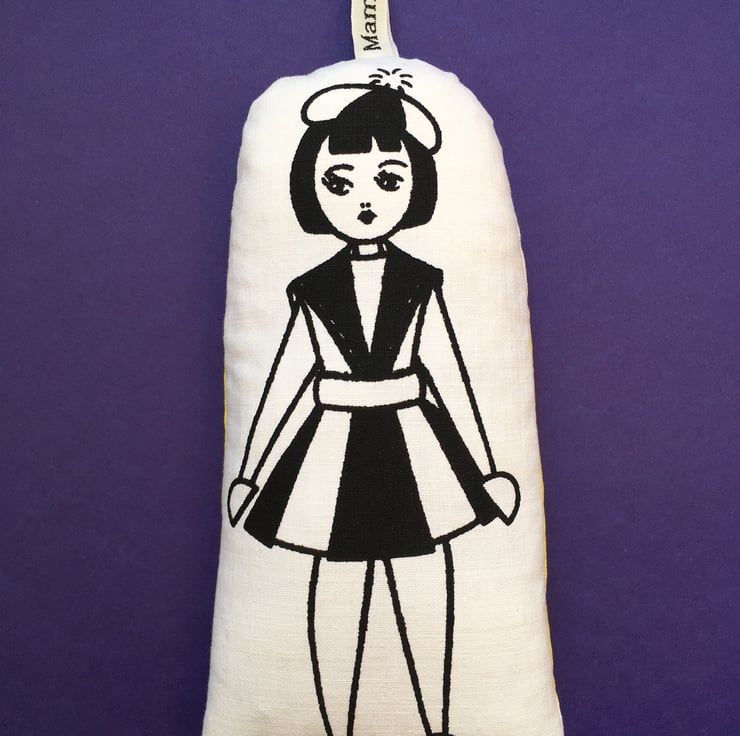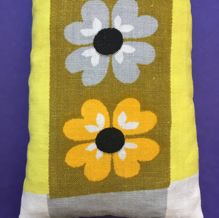 To make this lavender bag I have used a screen print of Berta, one of my vintage Polish dolls and original vintage 1960’s yellow and grey daisy printed cotton fabric.