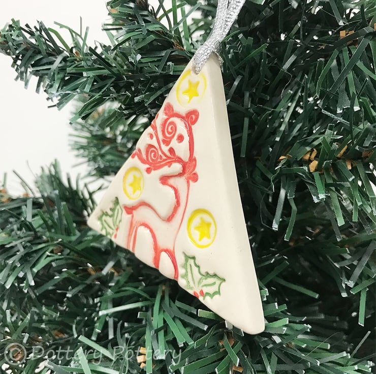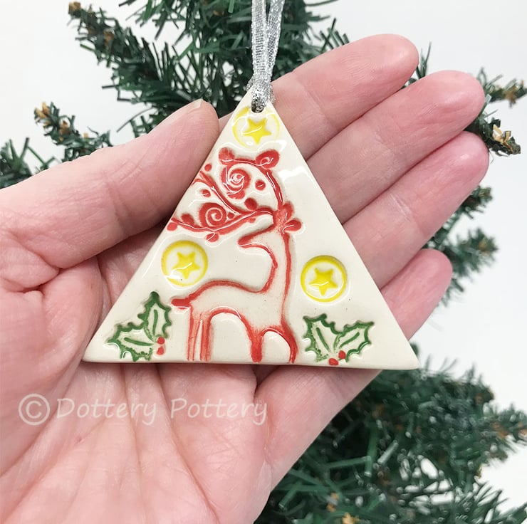 This listing is for a ceramic Christmas decoration with stag and stars. It's made from white earthenware clay, imprinted with pattern and finished with a clear, glossy glaze. It has been fired twice, once to the bisque stage and then a second firing for the glaze. It measures 7cm x 5.5cm x 1cm thick. It can also be hung outdoors.