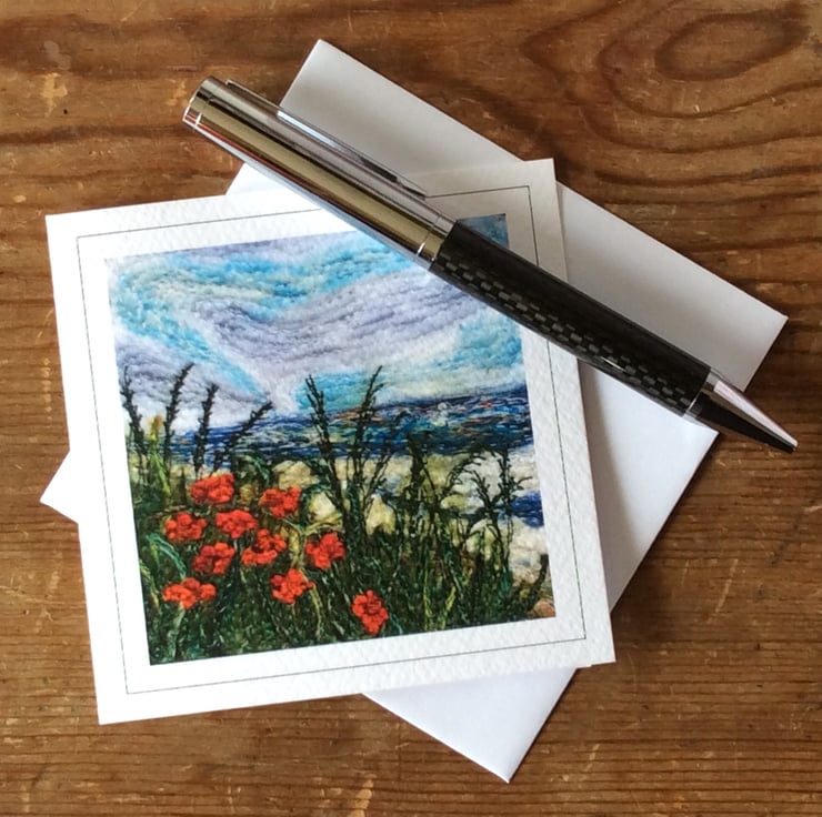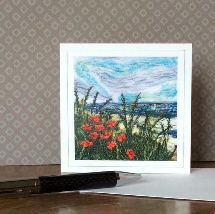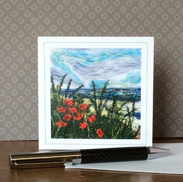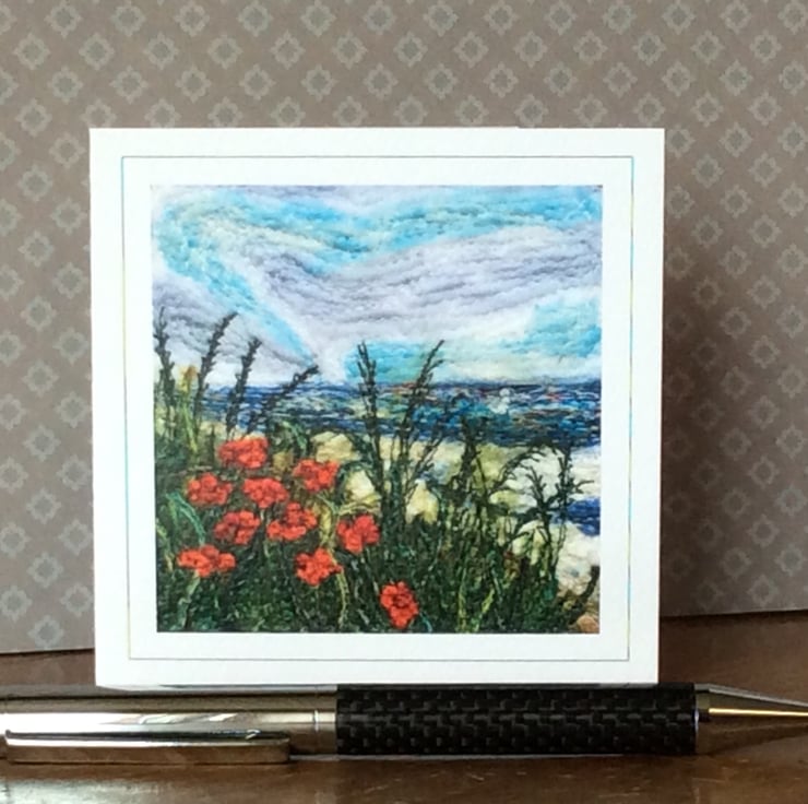 This beautiful card is a print of an original needle felting seascape I made. It’s a view over a poppy strewn grass banking to the beach and sea beyond. It's printed on thick Hammer White Card measuring 10 x 10cm. Comes with an envelop in a plastic cover for protection.