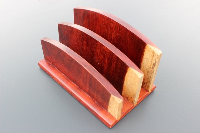 A minamilist design letter rack made from padauk (Pah - duke) wood. The wood is naturally dark red which changes to reddish purple over time. In this piece the grain / colour has been selected to provide a very distinctive pattern. The piece is finished in a satin lacquer.
