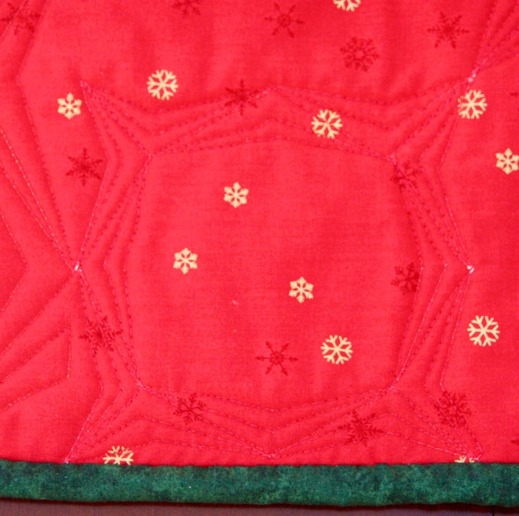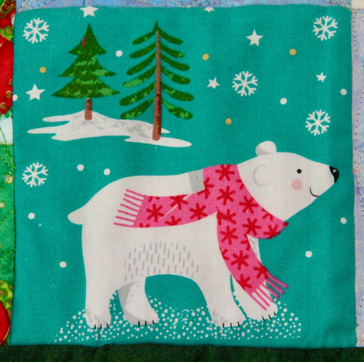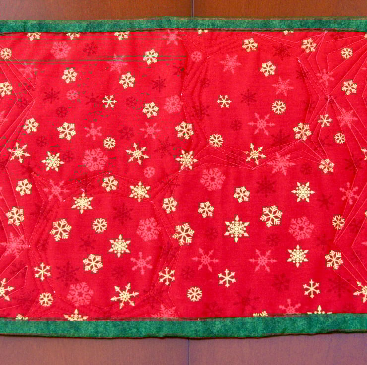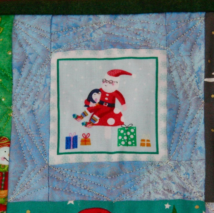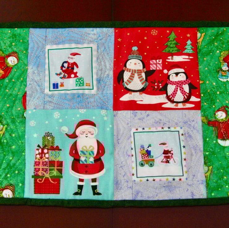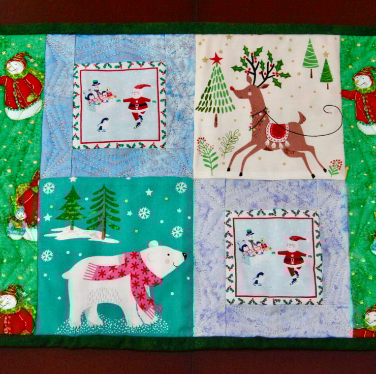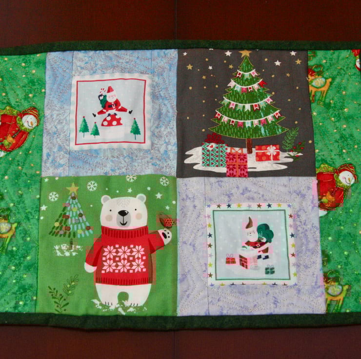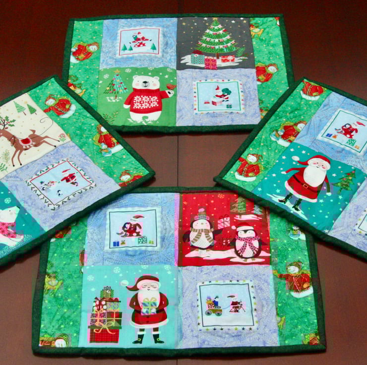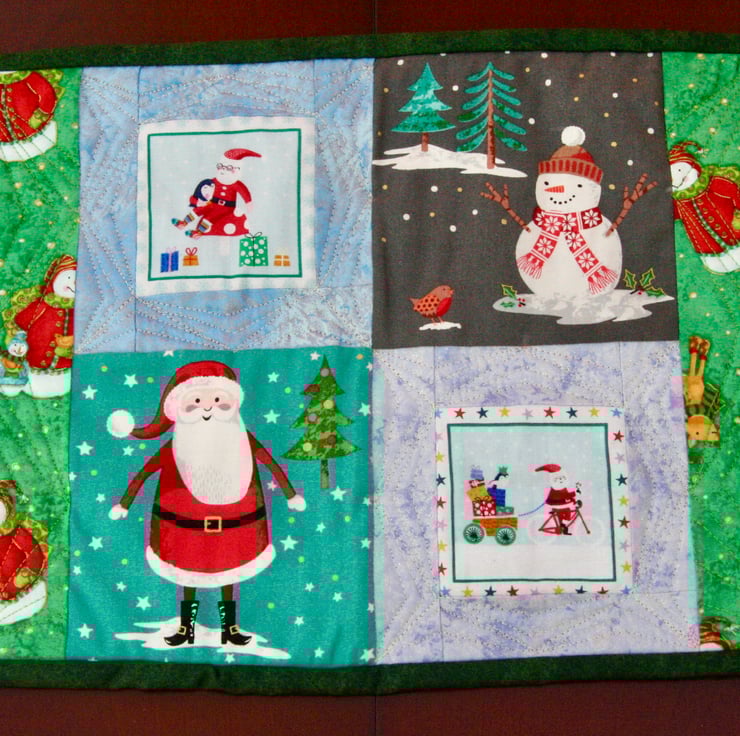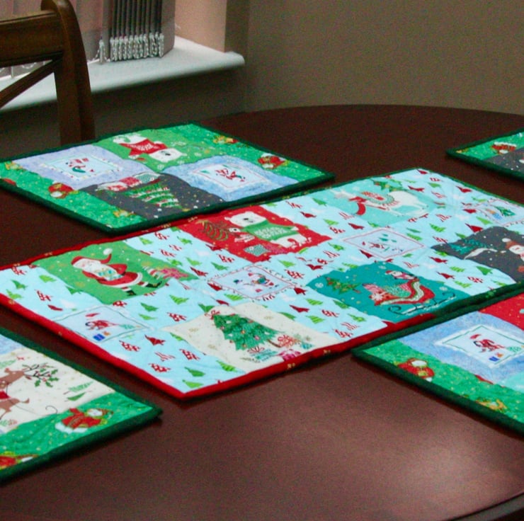 They have two larger panels with festive scenes and two small Santa pictures bordered with glittery cotton. The edges feature a some checky Snowmen. The backing is an ombre red cotton with golden snowflakes. The two layers are sandwiched between an eco-wadding made from recycled plastic bottles. The three layers are quilted together using free-motion quilting with a geometric design, and they have a red binding.