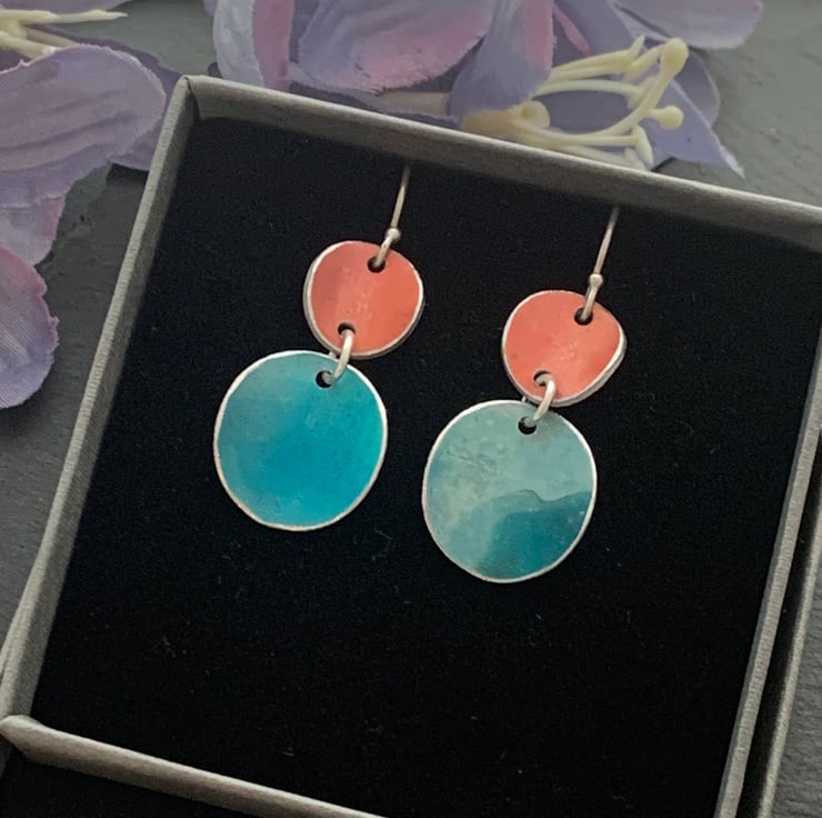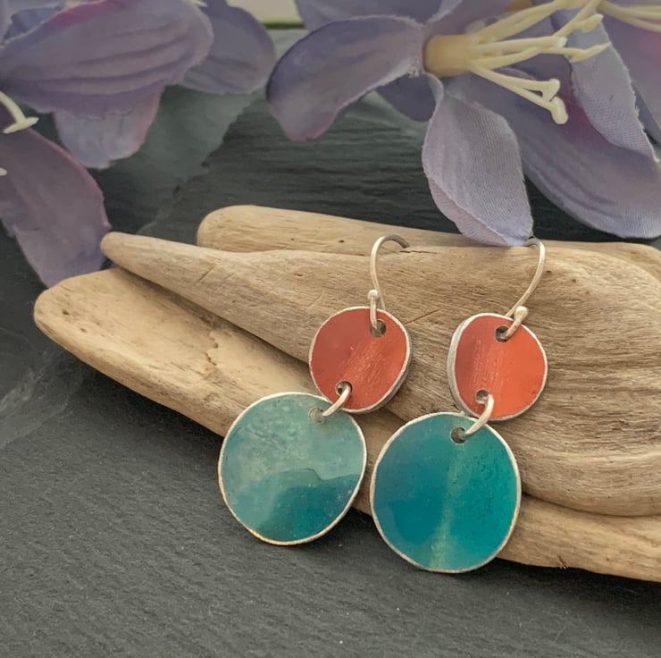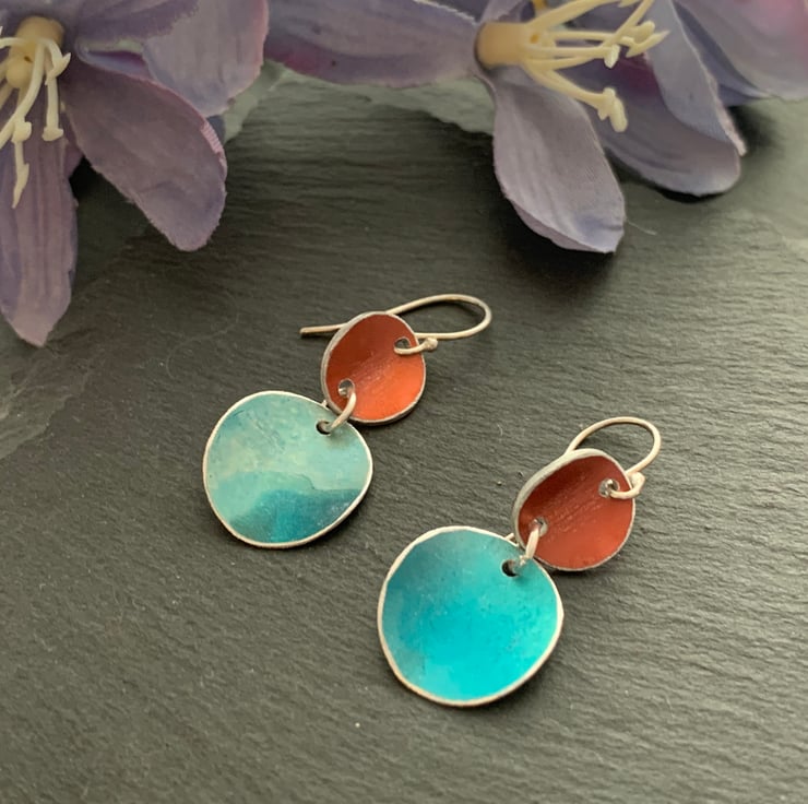 These earrings are made with a hand dyed/printed aluminium and sterling silver hook ear wires